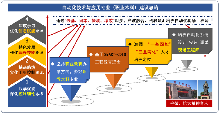 专业坚持职业教育办学方向,以“守敬精神、抗大精神”红色育人为引领,基于SMART-CDIO工程教育理念,遵循学校“一基四能”“三重两化”人才培养定位,以“一夯基、二固本、三提质、四增效”的建设思路进行专业建设。持续深化“三教改革”,实施职业教育项目课程开发,融入创新能力培养,稳步提升实践条件、教育质量和科研与社会服务能力,最终实现自动化技术与应用专业高端技能人才/自动化现场工程师的培养。