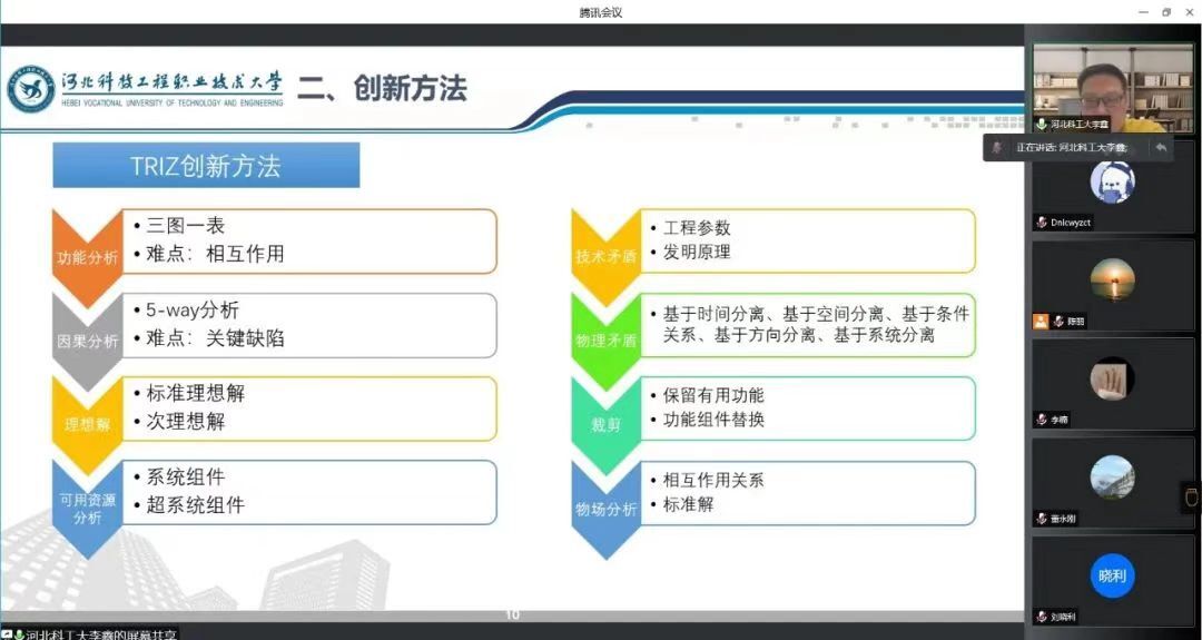 在教学中更需要将创新方法和思维传授给广大的学生,让同学们在创新创业中发挥自己的作用,实现自己的梦想、达成自己的抱负。以中国创新方法大赛为主要抓手,积极推动广大教师学生运用创新方法解决工程难题,申报国家专利,为培养更多的科创人才提供基石。