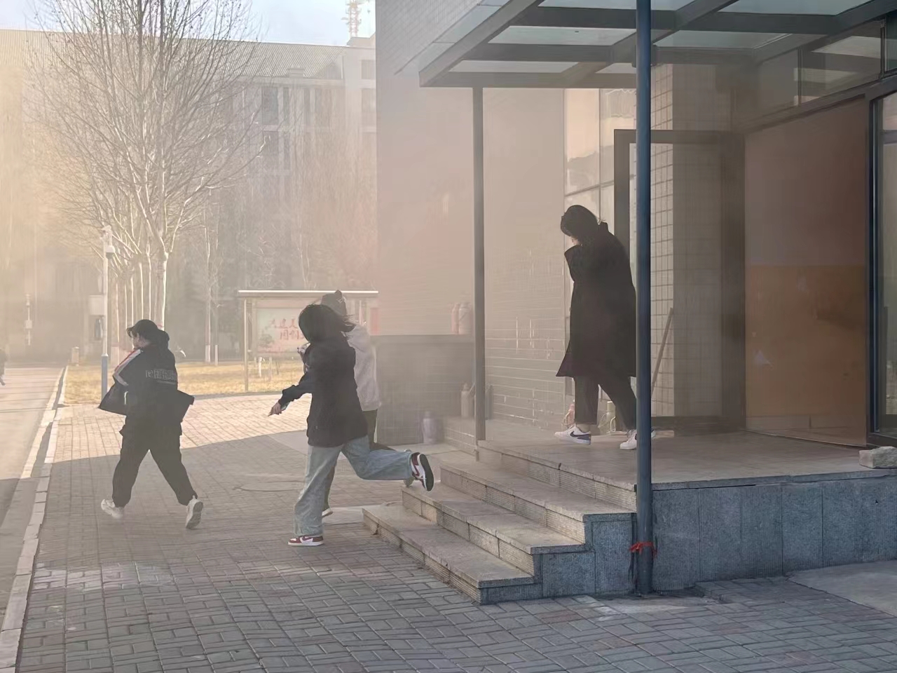 下午3点,六号楼前浓烟滚滚,同时响起疏散命令。在老师和消防员的组织下,同学们用小方巾或衣袖捂住口鼻,弯腰低姿,有序快速撤离宿舍楼,来到学校小广场,确保在较短时间内全部安全撤离现场。