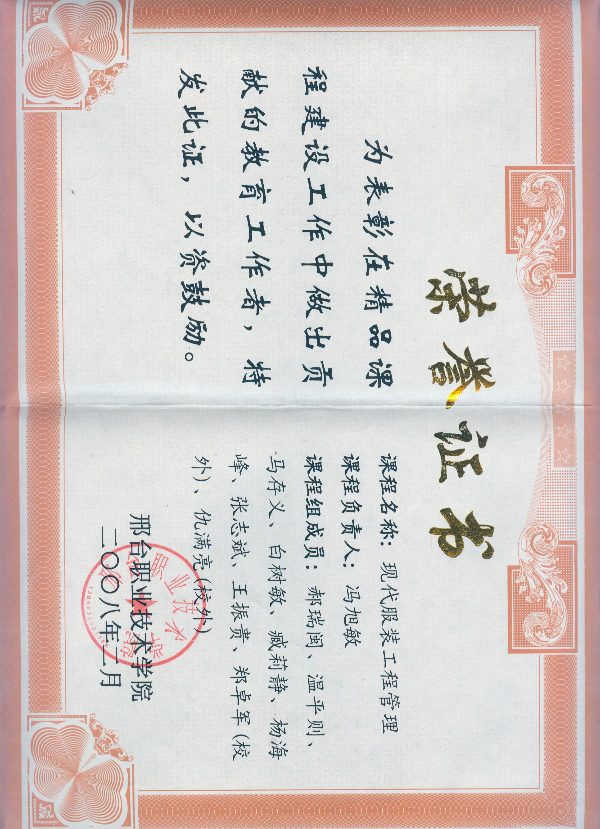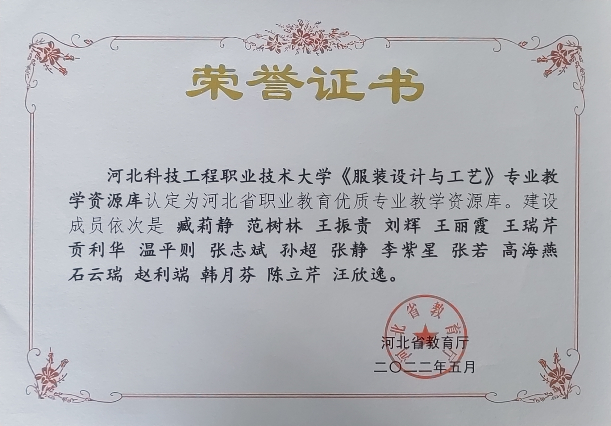 服装工程系获评国家级在线精品课4门(服装版型设计与工艺-女西服制作工艺、服装结构制图与样板-男装、女装结构设计、现代服装工程管理),国家级精品资源共享课3门(服装结构制图与样板、现代服装工程管理、鞋靴设计),服装设计专业国家教学资源库2门(服装商品企划、现代服装工程管理),校级精品课3门(服装技术基础、服装立体造型设计、服装CAD/CAM应用)。立项一流课程3门(智能化服装生产管理、服装款式构成设计、时尚设计表达)。立项国家级教学资源库1个(服装工程技术教学资源库),2024年纳入国家教育平台。资源库主持单位3家,学校成员单位15家,企业成员单位19家。资源库共涵盖6个本、专科专业,建设标准化课程63门,资源库课程体系包括7个子库,28个模块,涵盖35门课程和专业教学标准、专本衔接课程、行业企业标准、企业案例等丰富内容。获评省级资源库1个(服装设计与工艺教学资源库),参建3个教学资源库(服装与服饰设计教学资源库、服装陈列与展示设计专业教学资源库、服装设计专业教学资源库)。