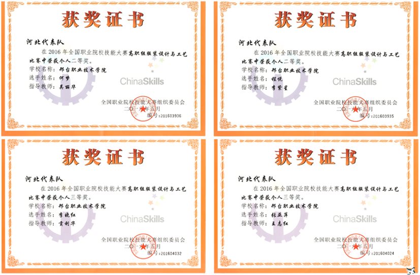 5月20日至23日,2016年全国高职院校技能大赛——服装设计与工艺赛项在杭州举行。本次大赛共有来自全国25个省市、自治区代表队的166名选手参加。我院服装工程系吴丽华、李紫星、王志红、贡利华等老师指导的学生们在大赛中再获佳绩,其中何梦、程悦在服装设计分赛项分别获得二等奖,李晓红、张亚萍在服装工艺分赛项分别获得三等奖。