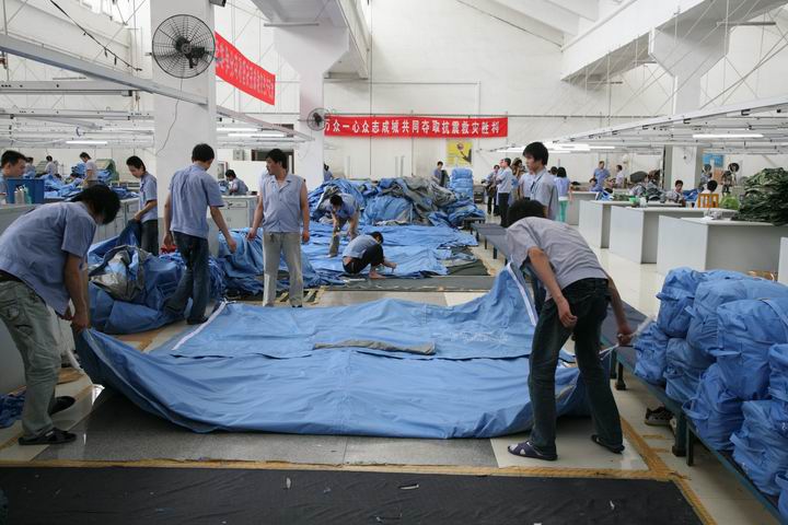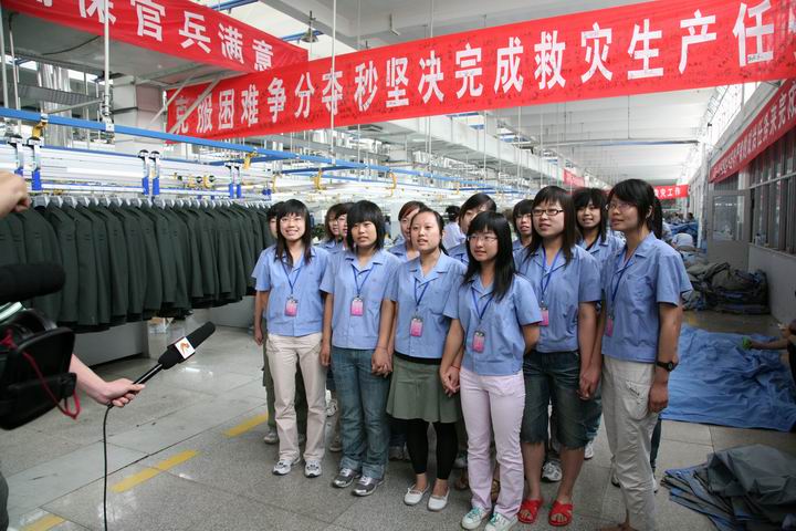5.12四川汶川大地震发生后,际华三五零二职业装有限公司承担了灾区帐篷以及救灾武警迷彩服的生产加工任务。为共同抗震救灾,支援生产,我院服装工程系先后派出服装设计与加工专业061、062两个班计100余人到际华三五零二职业装有限公司进行轮岗实习协助生产。同时计划于7月份再派遣服装设计与加工专业试点班078班50人利用工作学期到该公司轮岗。在生产过程中,实习同学发扬了不怕苦、不怕累的精神,同公司职工一起加班加点进行救灾物资生产,公司领导及技术人员对学生吃苦耐劳、团结协作的军队工作作风、过硬的专业能力给予了高度的评价。