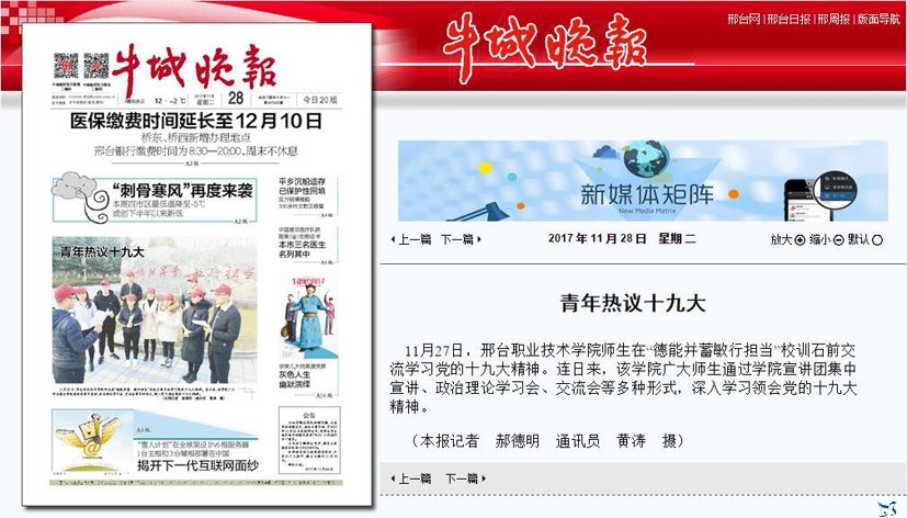 11月28日,继河北长城网报道我院学习十九大盛况后,《牛城晚报》首页刊登了我院师生在“德能并蓄 敏行担当”校训石前交流学习党的十九大精神的图文报道。