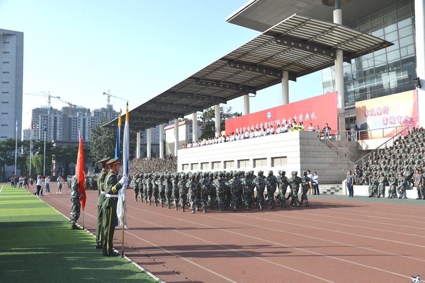 典礼在庄严的国歌声中拉开帷幕,鲜艳的五星红旗在两面校旗的护卫下,随着雄壮的国歌声冉冉升起,高高飘扬在校园上空。升旗仪式结束后,在院国旗护卫队的带领下,2017级新生军训分列式汇报表演正式开始,各系方队在雄壮的军乐声中依次经过主席台,接受学院领导的检阅,5000余名军训新生队列整齐,步伐一致,口号响亮,意气风发,展现出良好的军人素养、严谨的思想作风、奋发向上的精神风貌和朝气蓬勃的青春气息。