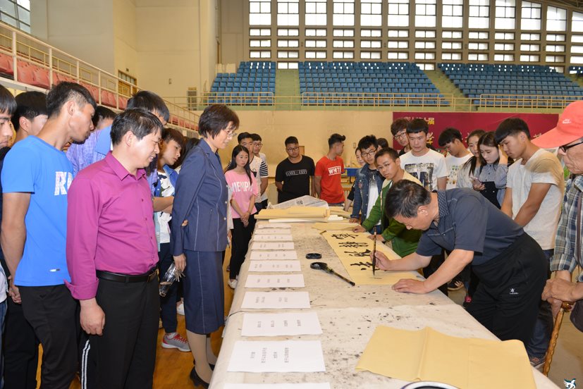 来到学院体育馆,刘彩琴副书记首先带领大家观看了我院大学生书法作品展,社区书协的先生们对我院学生书法作品一一作了细致点评,并亲自指导如何布局、如何做到提笔有神,同学们认真听取先生们的讲解并不时提问,现场交流和谐而又默契。来到科技作品展区和书画作品展区,参观人员对于我院参展作品和浓厚的校园文化气息兴致浓浓,赞不绝口。在接下来的书法交流活动中,先生们不吝墨宝,纷纷上前挥毫泼墨,并在书写过程中给在场围观的爱好者们耐心讲授书法常识和书写技巧。在两个小时的活动中,社区书协的先生们和兰亭书社的书法爱好者们共同写下了对学院的祝福、对学生的鼓励以及对美好生活的憧憬,整场交流联谊活动书香四溢、气氛热烈。