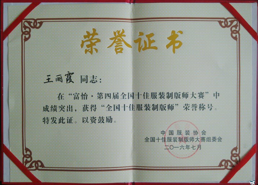 王丽霞老师自1994年毕业留校任教以来,一直致力于专业技术的钻研,2012年带领我院服装专业的老师们进行资源共享课程建设,《服装结构制图与样板》获国家资源共享课;2014年参加“九牧王杯”中国裤装设计(精英)大赛,获男装裤类“银奖”,获“十佳裤装设计师”奖;本次以总评第二名的成绩荣获“全国十佳服装制版师”荣誉称号。这系列成果的取得彰显了我院服装工程系优秀的师资队伍及办学实力。