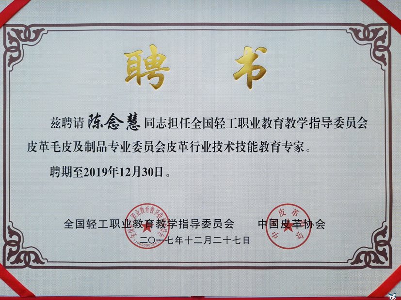 此外,我院陈念慧老师在本次会议上被主办方聘为全国轻工职业教育教学指导委员会皮革皮毛及制品专业指导委员会副秘书长和皮革行业技术技能教育专家。