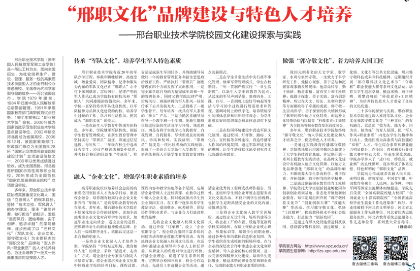 8月10日,中国教育报第四版刊登了《“邢职文化”品牌建设与特色人才培养》一文,宣传介绍了我院校园文化建设成果。