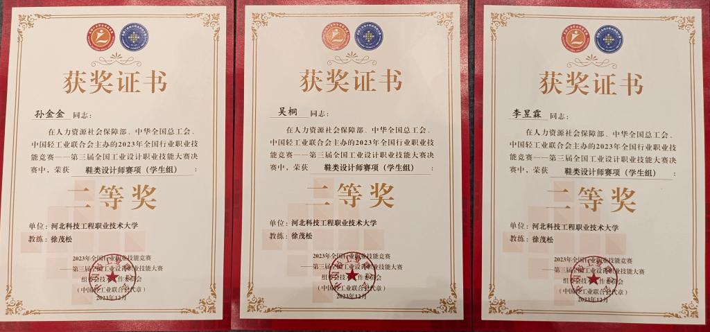 12月2日-6日由人力资源社会保障部、中华全国总工会、中国轻工业联合会主办的第三届全国工业设计职业技能大赛决赛在四川宜宾成功举办。best365服装工程系鞋类设计与工艺专业22级学生李昱霖、吴桐、孙金金三人组队(教练:徐茂松),经过顽强拼搏获得鞋类设计师赛项学生组二等奖。鞋类设计与工艺专业15级毕业生杜冲代表漯河强人商贸有限公司组队参赛,获得职工组一等奖(冠军选手),他个人也将被人力资源和社会保障部授予“全国技术能手”荣誉称号,可按程序申报“全国五一劳动奖章”。