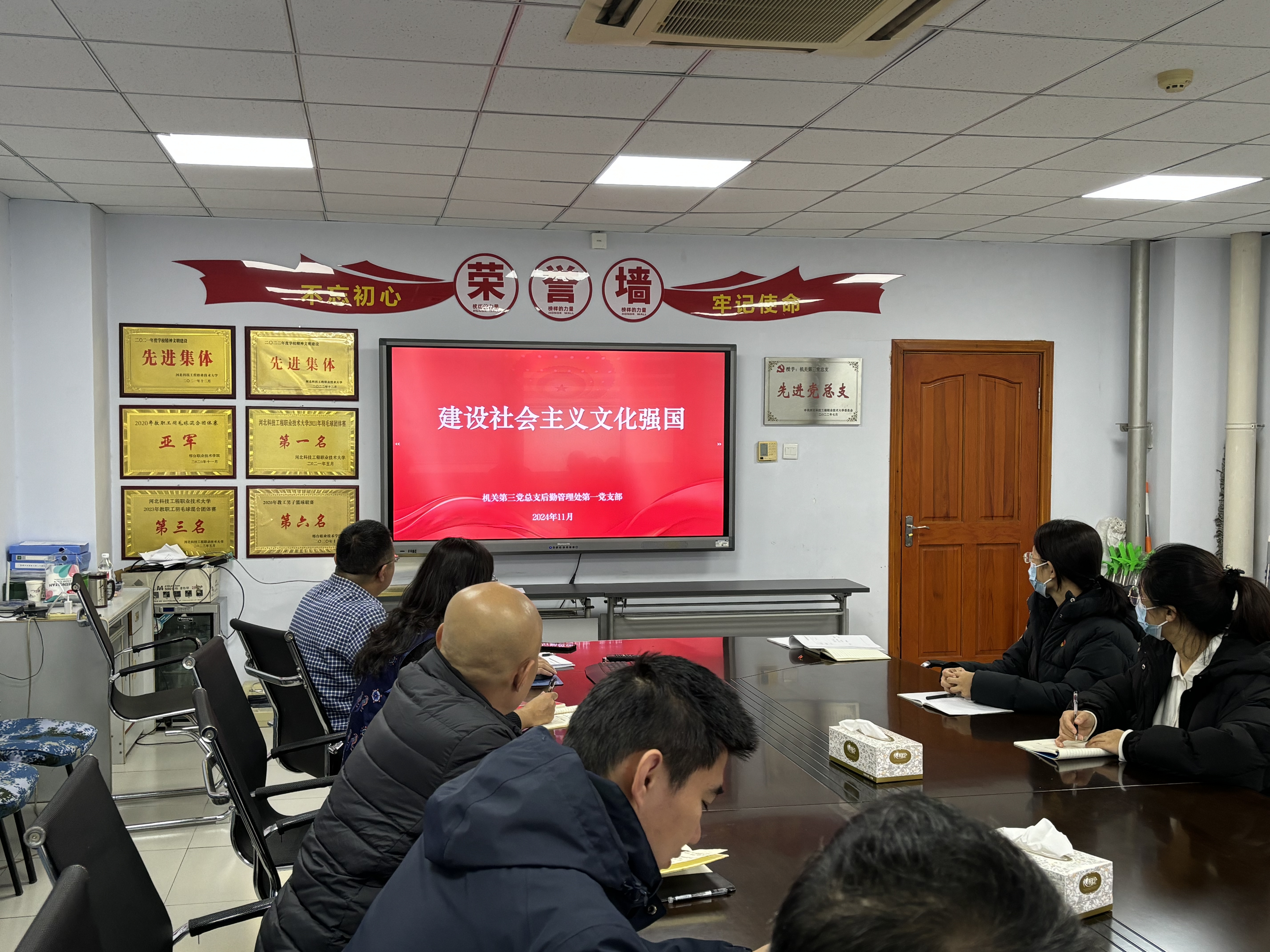 2024年11月14日,机关第三党总支后勤管理处第一党支部在主教902举办了以“深入学习习近平文化思想及习近平总书记在二十届中央政治局第十七次集体学习时的重要讲话精神”为主题的11月主题党日活动。此次活动由党支部书记杜磊主持,全体党员积极参与。