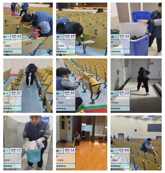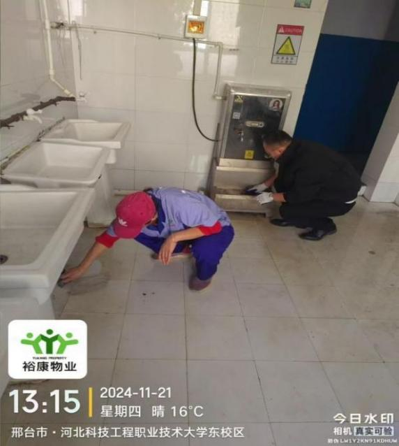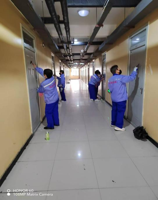 学生公寓物业重点对楼宇外墙、门头雨塔、厕所墙、便池墙面、水房门、水池、宿舍门、楼道、楼梯等角落卫生进行了全方位卫生清理,为同学们在校学习和生活提供了一个舒适的居住环境。