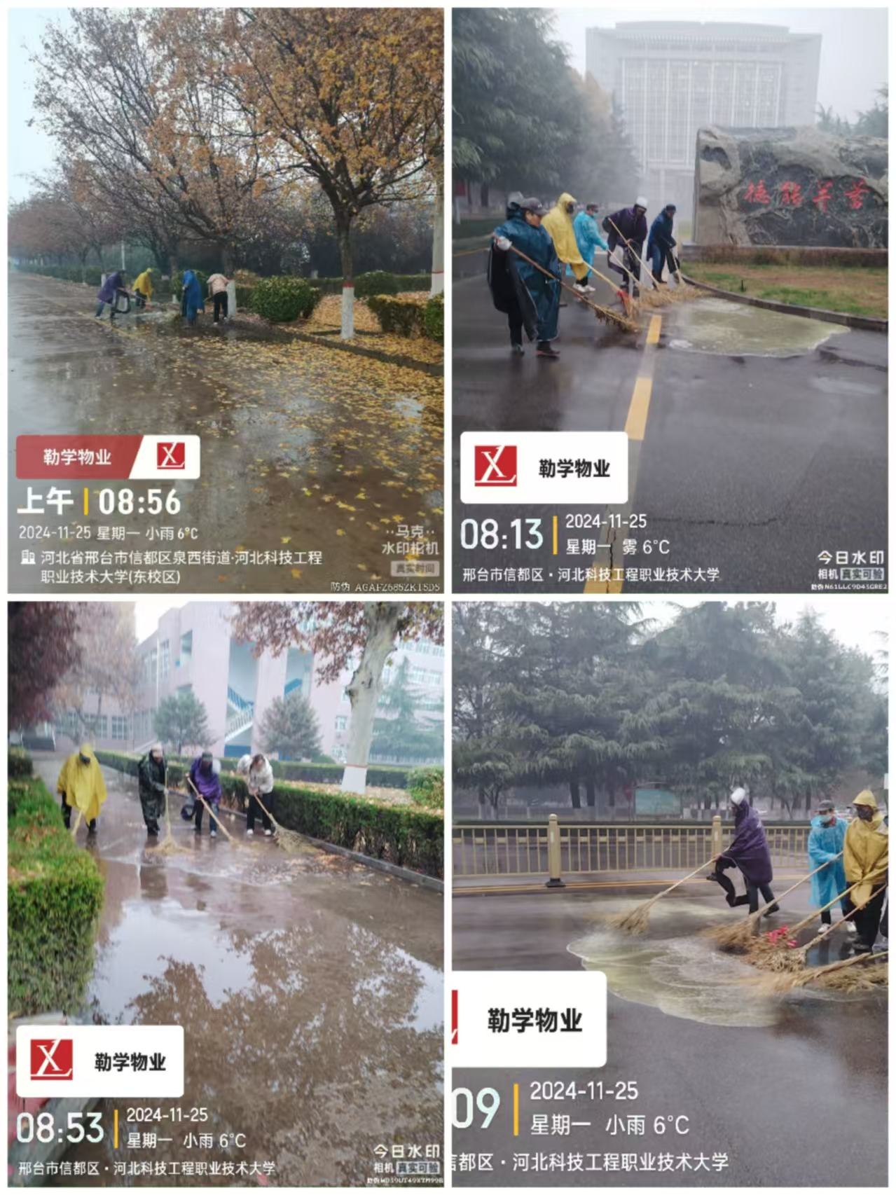 外围物业对校园道路、公寓区教学区角落卫生、垃圾场、绿化带等区域进行彻底清扫,对卫生死角中的土堆、碎石、砖块、杂草、泡沫箱等进行全面清理。绿化工人开展树木保温及涂白相关工作,以有效防治病虫害。同时对新种植的草坪和绿植浇灌冻水,修剪了绿植的新芽和造型,美化了校园环境。