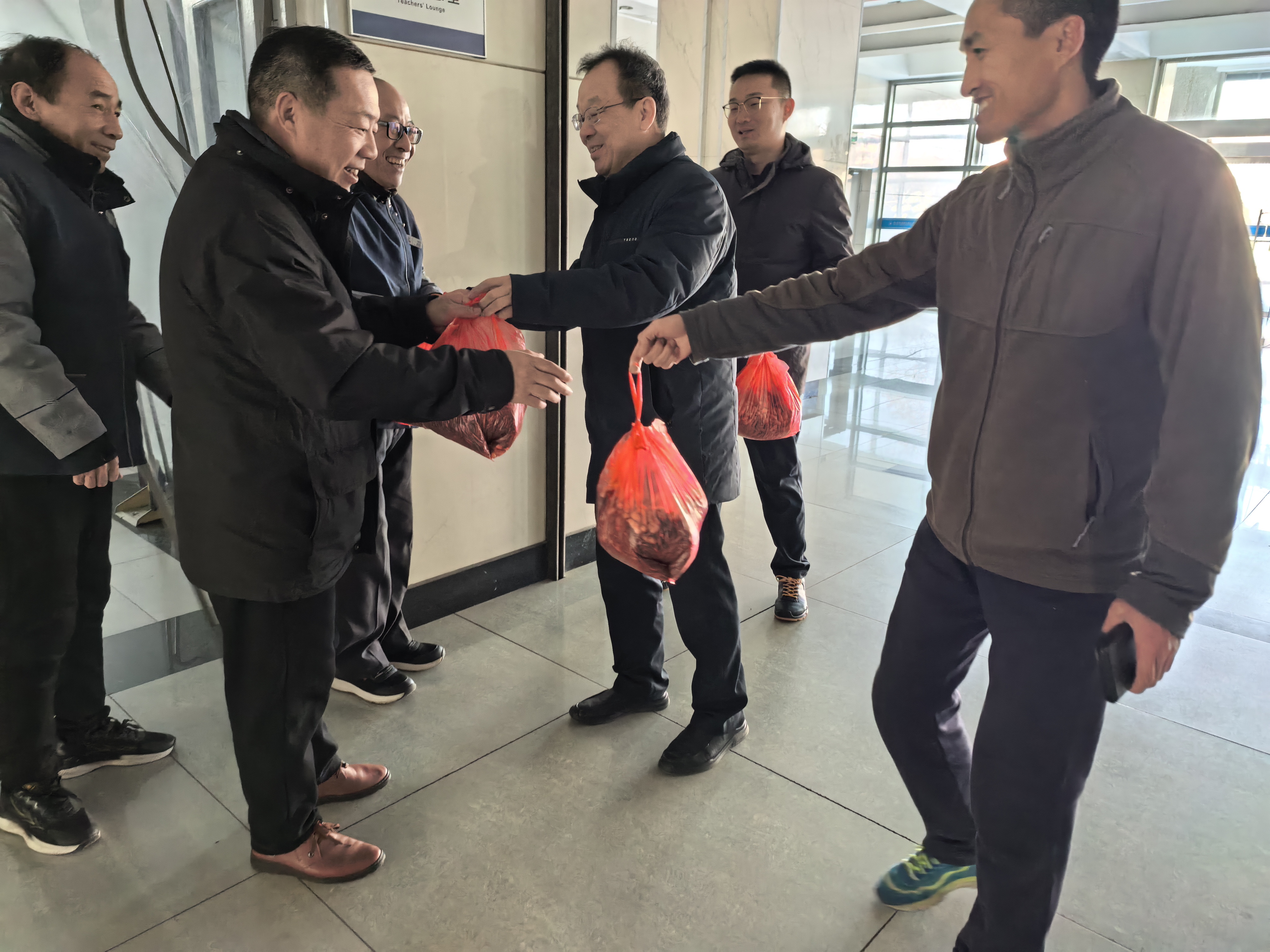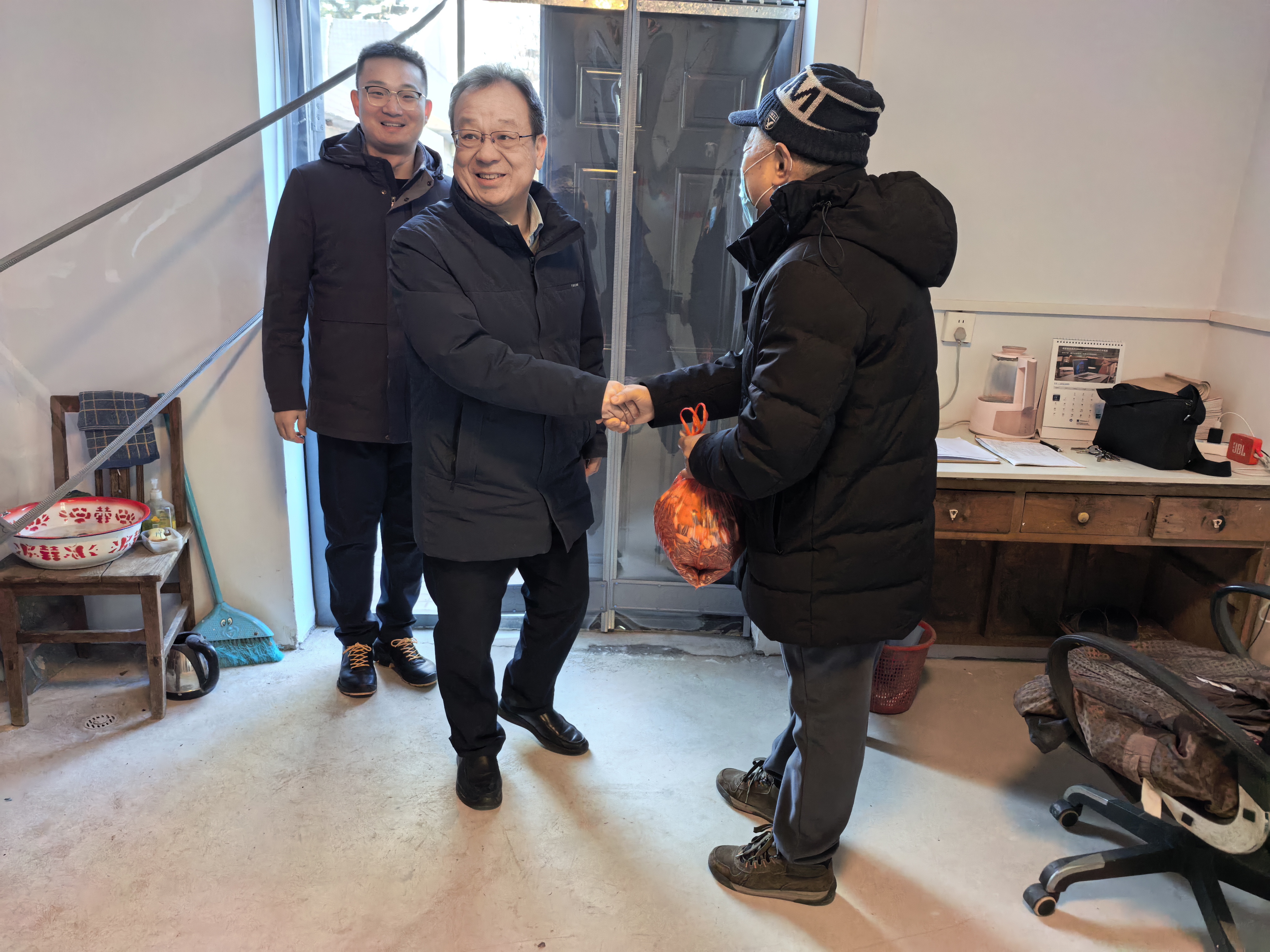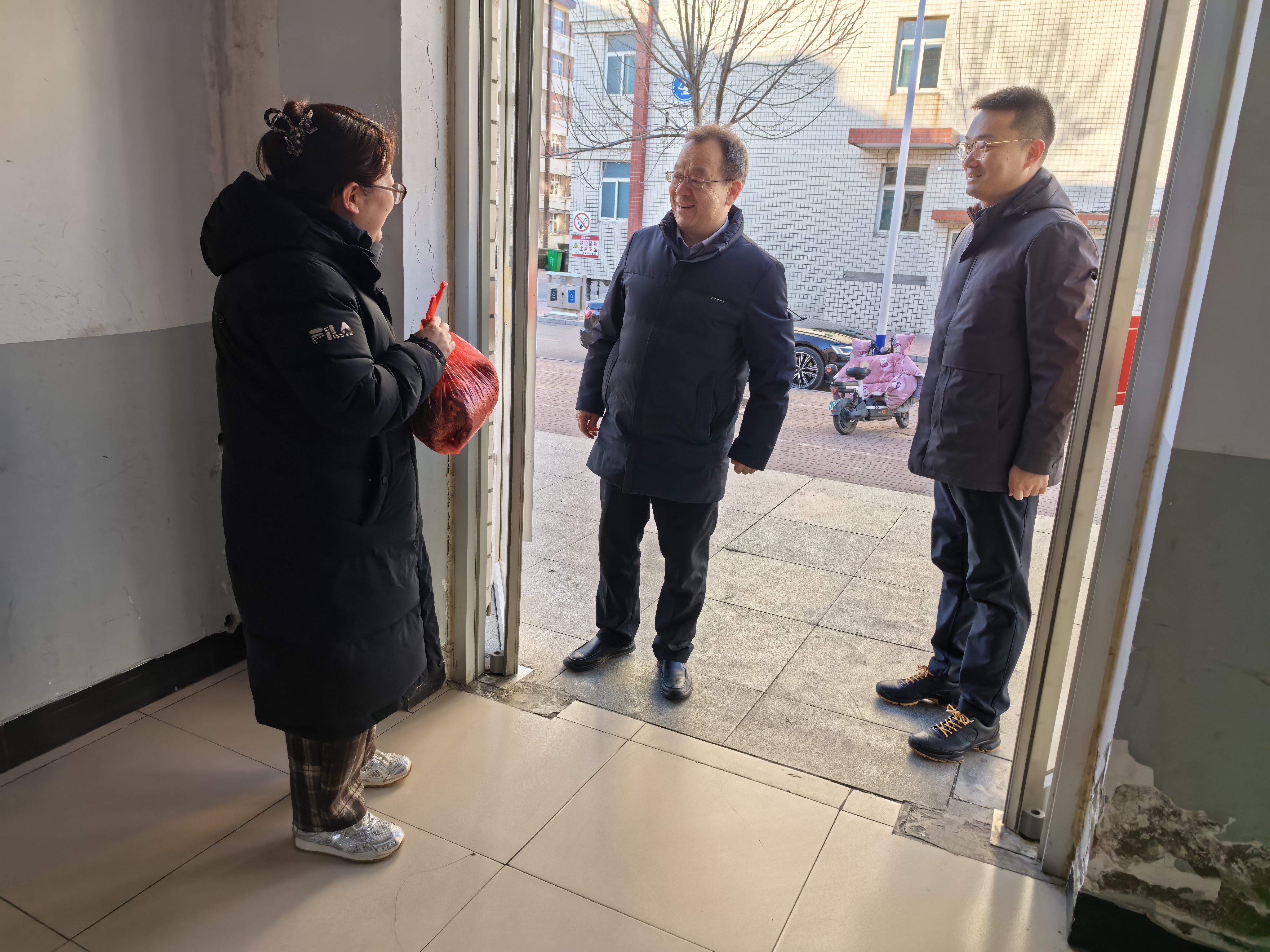 在公寓7号楼值班室,赵建光与值班人员亲切交谈,了解他们的工作和生活情况,并叮嘱他们注意保暖和安全。主楼物业值班室的工作人员同样收到了暖心的慰问,他们负责校园的清洁和安全,是校园环境的守护者。