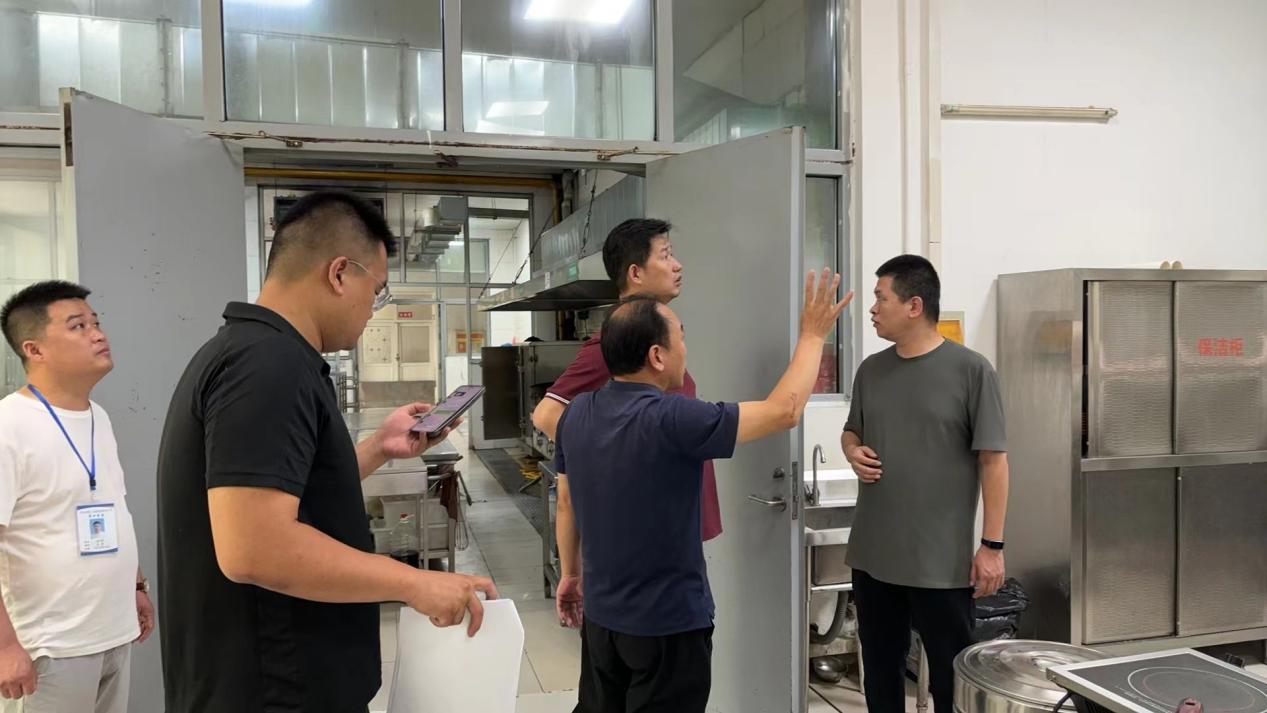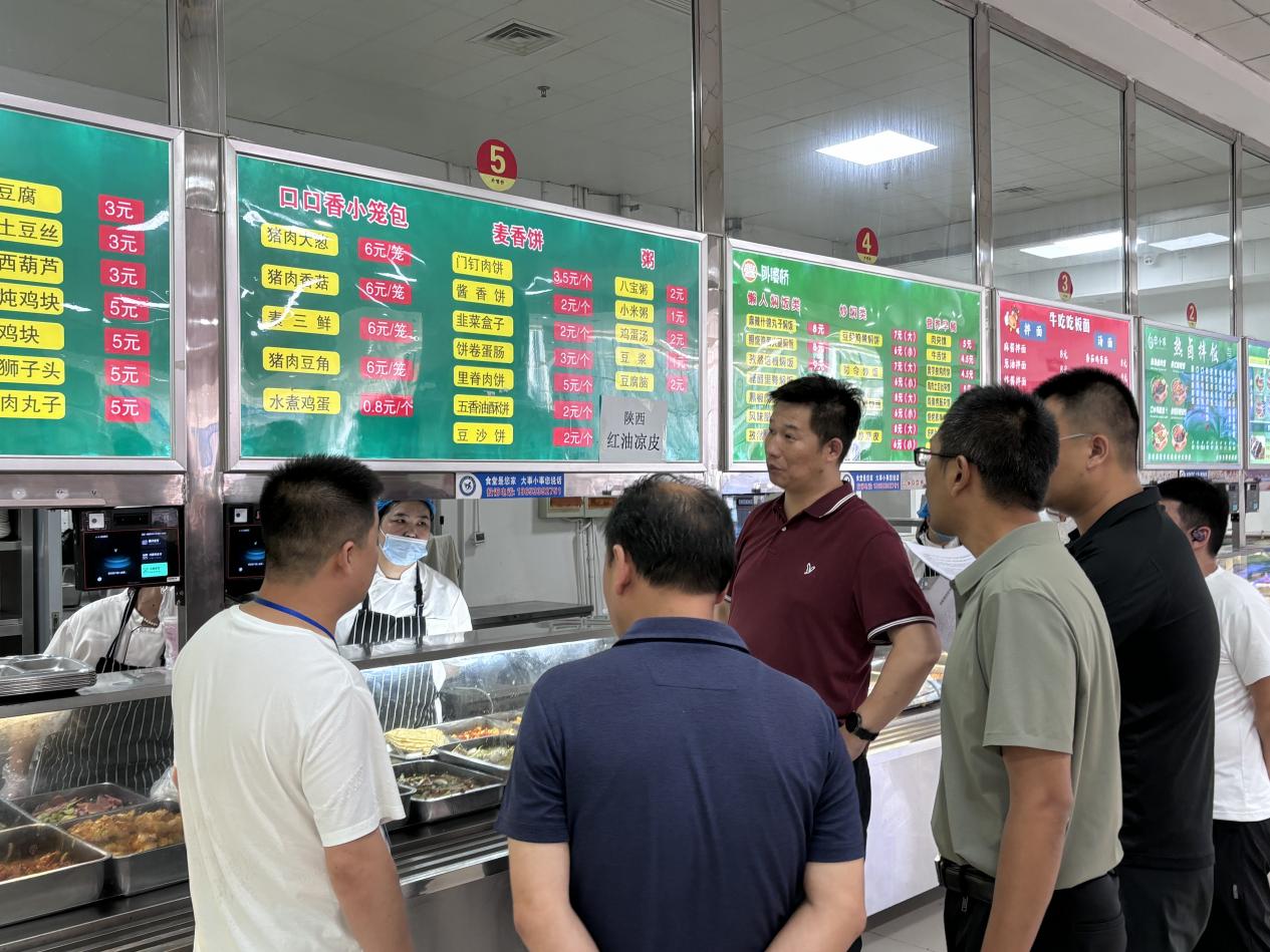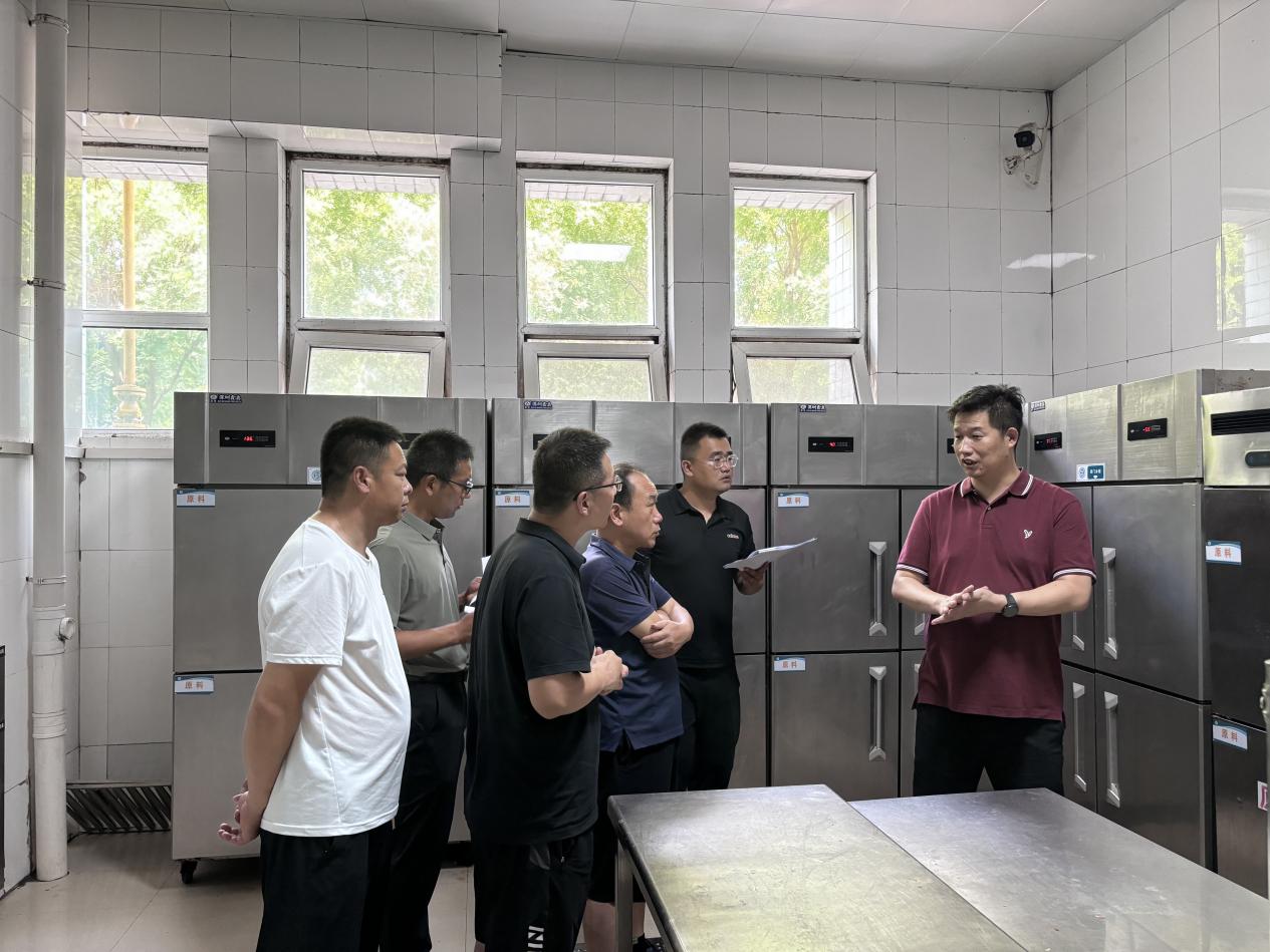 随后检查组来到校园东区和西区食堂,主要围绕学校食堂经营管理情况和食品安全卫生管理情况进行实地查看,重点检查了师生就餐大厅清洗消毒状况、菜品结构、材料供应与储备、操作间设施设备、食堂后厨食品安全卫生等环节的落实情况。李磊指出,要始终高度重视材料存储及加工过程中的安全卫生问题;切实做好燃气安全、消防安全工作;安排好设施检修和设备配置工作,利用假期时间完成维修改造,切实做好新学期伙食保障工作。