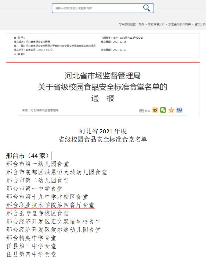 近日,河北省市场监督管理局公布了省级校园食品安全标准食堂名单,best365西校区第四餐厅食堂凭借规范的管理体系、过硬的后厨设施条件、优越的就餐环境通过了评定,被授予“2021年度省级校园食品安全标准食堂”称号。