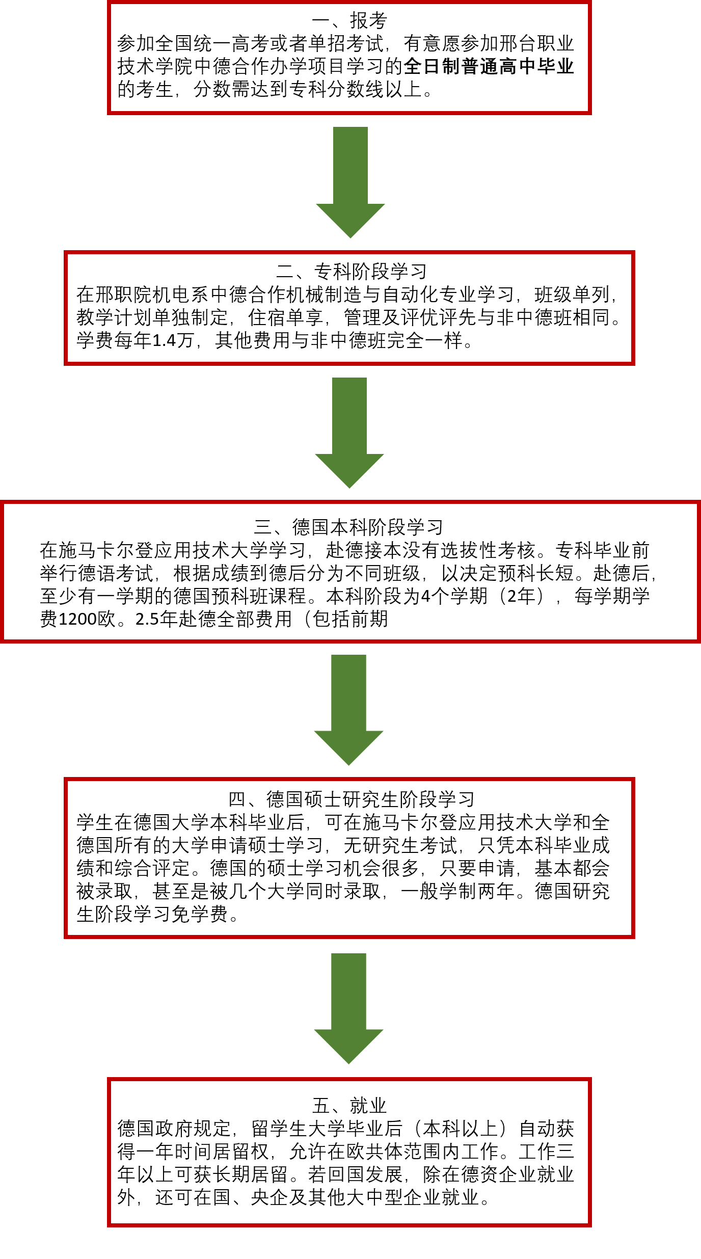 1、专科阶段:在邢台职业技术学院就读,学费人民币14000元/年,大三下学期(第六学期)有可选收费德语强化班,强化费人民币15000元。