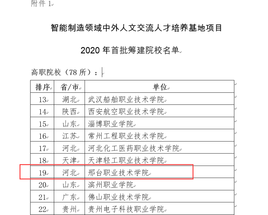 近日,教育部中外人文交流中心《关于智能制造领域中外人文交流人才培养基地项目2020年入选院校的通知》传来喜报,我院成功入选首批筹建合作院校。该项目评选于2019年10月份启动,我院机电工程系高度重视,认真组织申报材料,项目经过书面评审项目申报书,综合考虑院校基础、建设方案及专家意见,全国共100所院校(含本科、高职、中职)成为首批筹建合作院校。