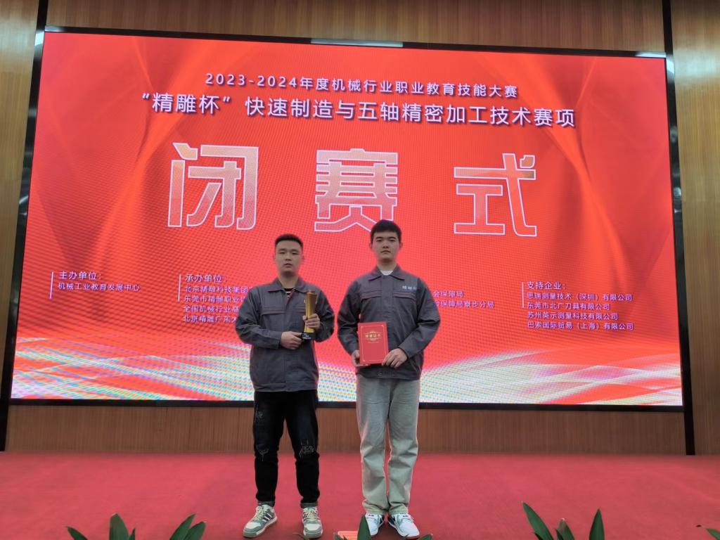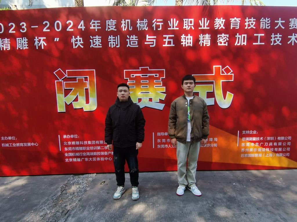 2023年12月21日-24日,机械行业职业教育技能大赛“精雕杯”快速制造与五轴精密加工技术大赛在东莞举行。本届大赛由机械工业教育发展中心主办,北京精雕科技集团有限公司承办。大赛共吸引来自全国17个省市57所院校的68支队伍124名选手参赛,设有数控编程与仿真、五轴数控加工、在机检测、装配等多个考核模块,综合考察参赛选手在工艺编程、机床实操和赛件装配等方面的专业知识储备与技能水平,比赛历时五个小时。best365机电工程系教师马辉指导的张世浩、戴博宇两位同学在本次大赛中表现出色,荣获“精雕杯”全国一等奖。