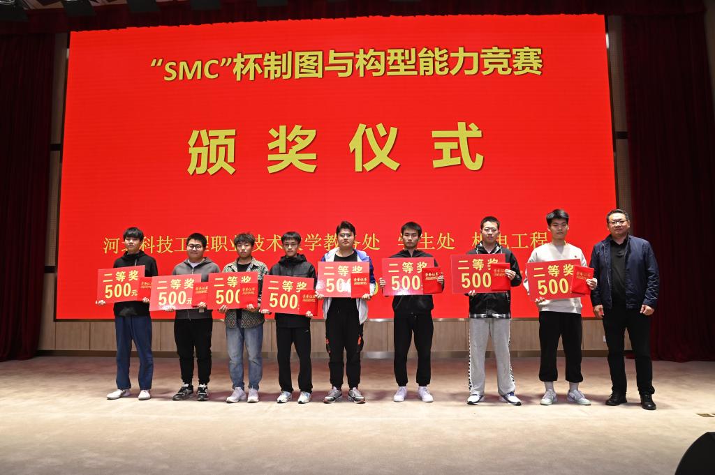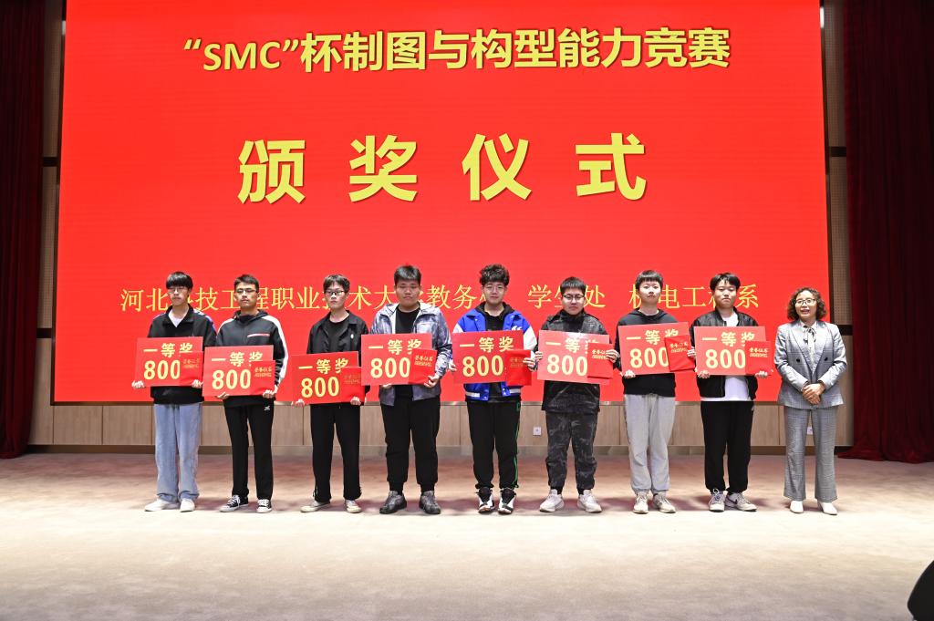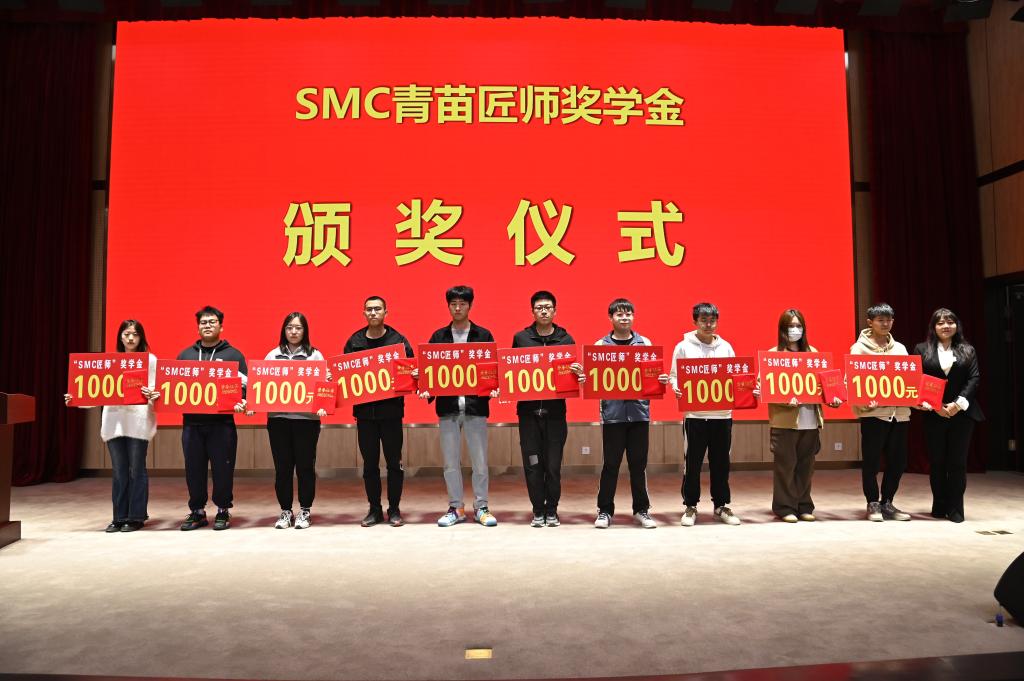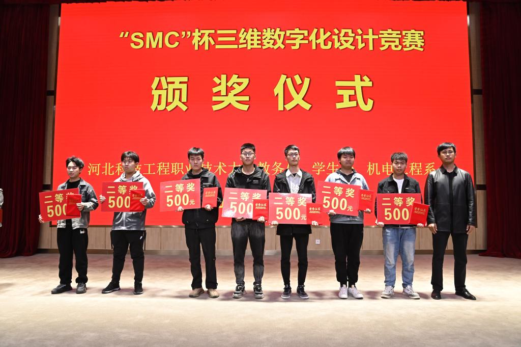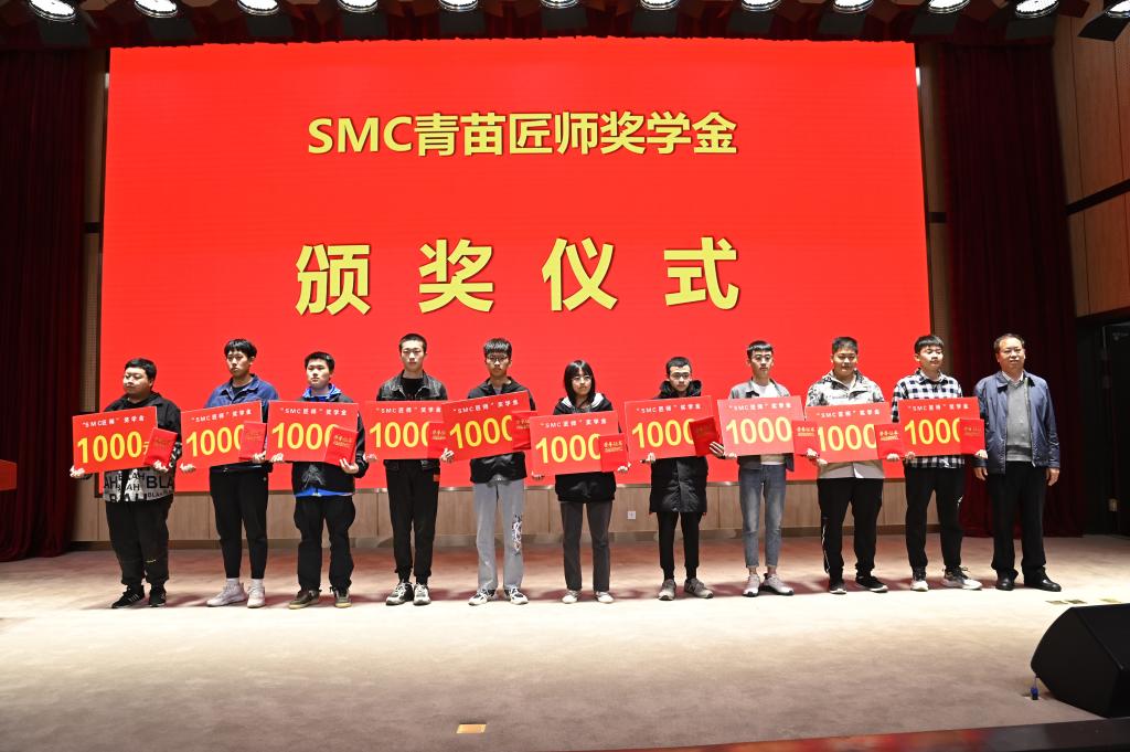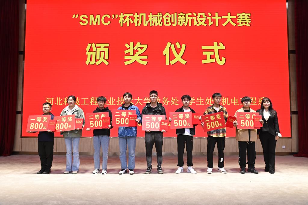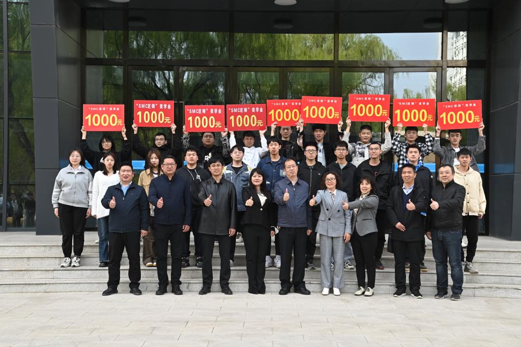 然后与会领导分别为“SMC青苗匠师奖学金”获得者颁发了1000元奖金和荣誉证书,为2022“SMC杯”系列竞赛一等奖、二等奖获得者分别颁发了800元和500奖金和荣誉证书,获奖学生人数达到100多人,共计颁发6万元奖励金。机电工程系高英敏主任宣布2023年“SMC”杯大学生创新设计系列竞赛的序幕正式拉开。最后,与会领导和获奖同学合影留念,为这次校企合作活动画上完美的句号。