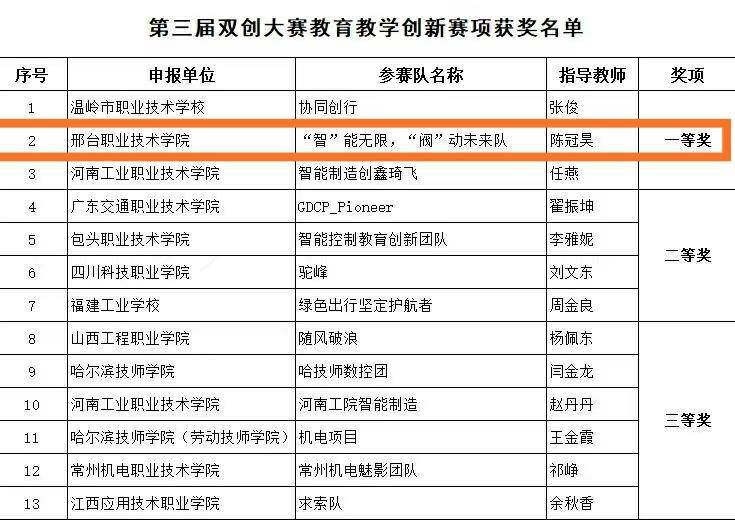2020年12月27日,机电工程系老师朱良、陈冠昊、刘德华及学生张朝阳、李海鹏、孙洪智组成的“智能无限、阀动未来”团队参加了第三届机械行业职业院校教育教学创新及创业大赛,并获得一等奖的优异成绩。