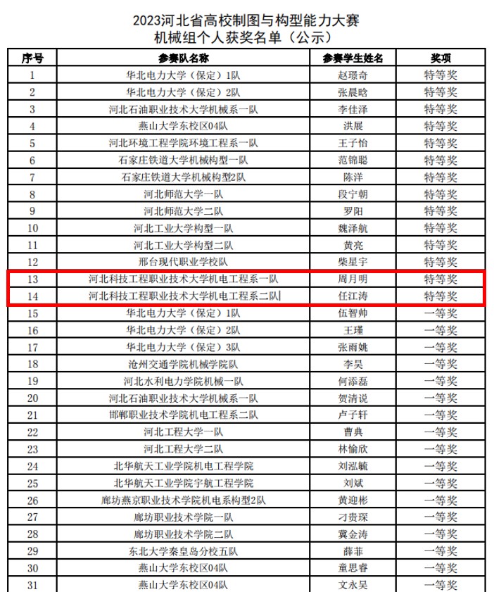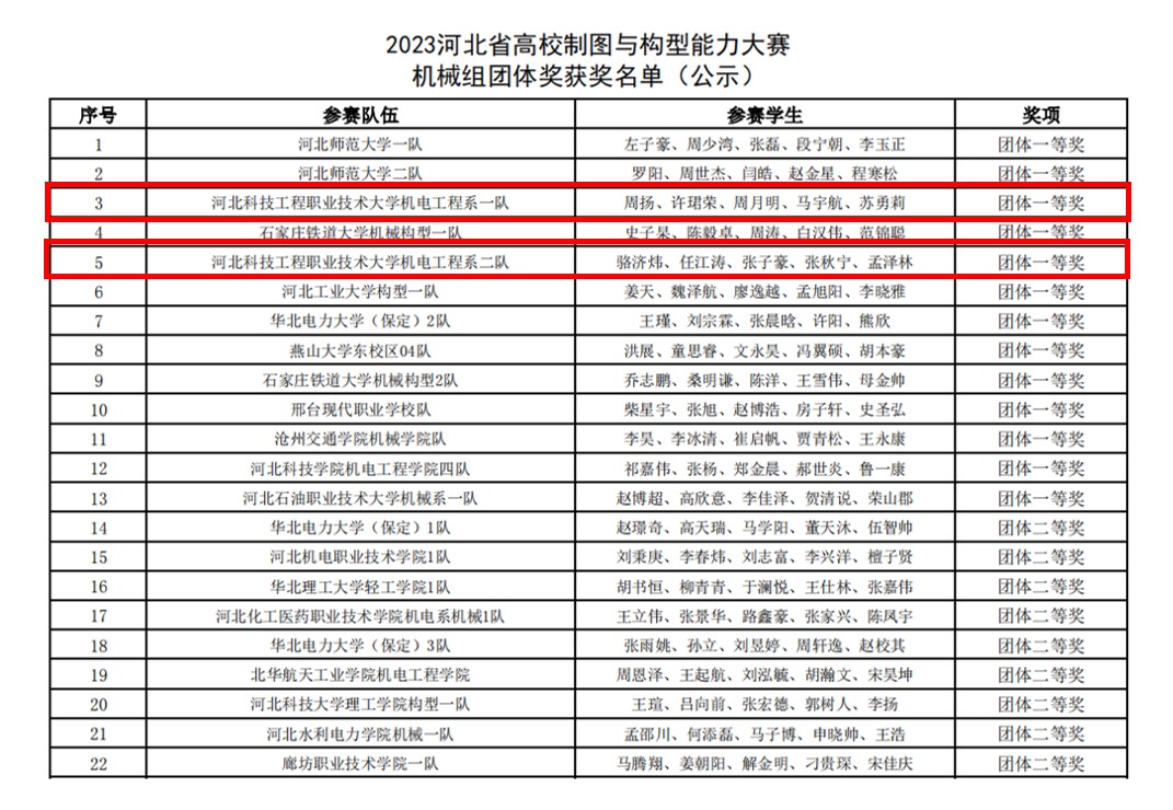 为推动图学教育事业的发展,着力培养大学生的动手能力、自主创新能力及大国工匠精神,更好地服务于大学生创新创业,5月27日,河北省教育厅和河北省图学会共同举办2023年河北省高校制图与构型能力大赛和三维设计大赛。机电工程系派出4队同学参加比赛,获得团体一等奖3项,个人特等奖2项,一等奖5项,二等奖10项,三等奖1项的好成绩。