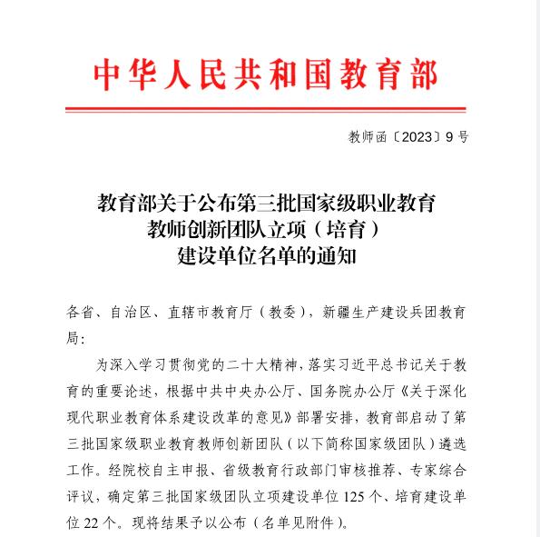 近日,教育部公布了第三批国家级职业教育教师创新团队立项建设单位名单,机电工程系机械设计制造及自动化教师创新团队成功入选。