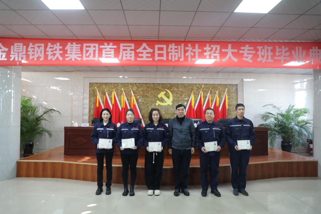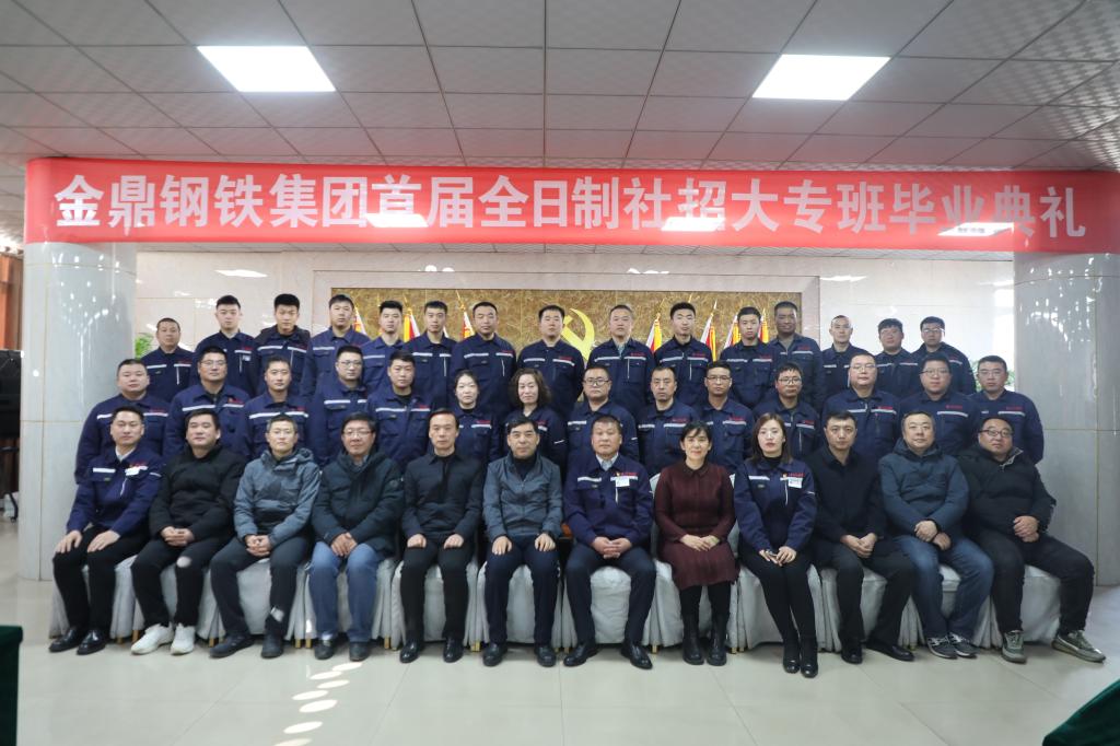 1月4日,首届金鼎钢铁集团全日制社招大专班毕业典礼在金鼎钢铁集团隆重举行。学校副校长李贤彬、金鼎钢铁集团行政总裁孙志刚,best365招就处、教务处、机电工程系、经济管理系等部门主管领导和相关教师,以及2023届机械制造及自动化专业、电子商务专业社招班毕业生出席本次典礼。典礼由金鼎钢铁集团企管、人事部部长姚贵霞主持。