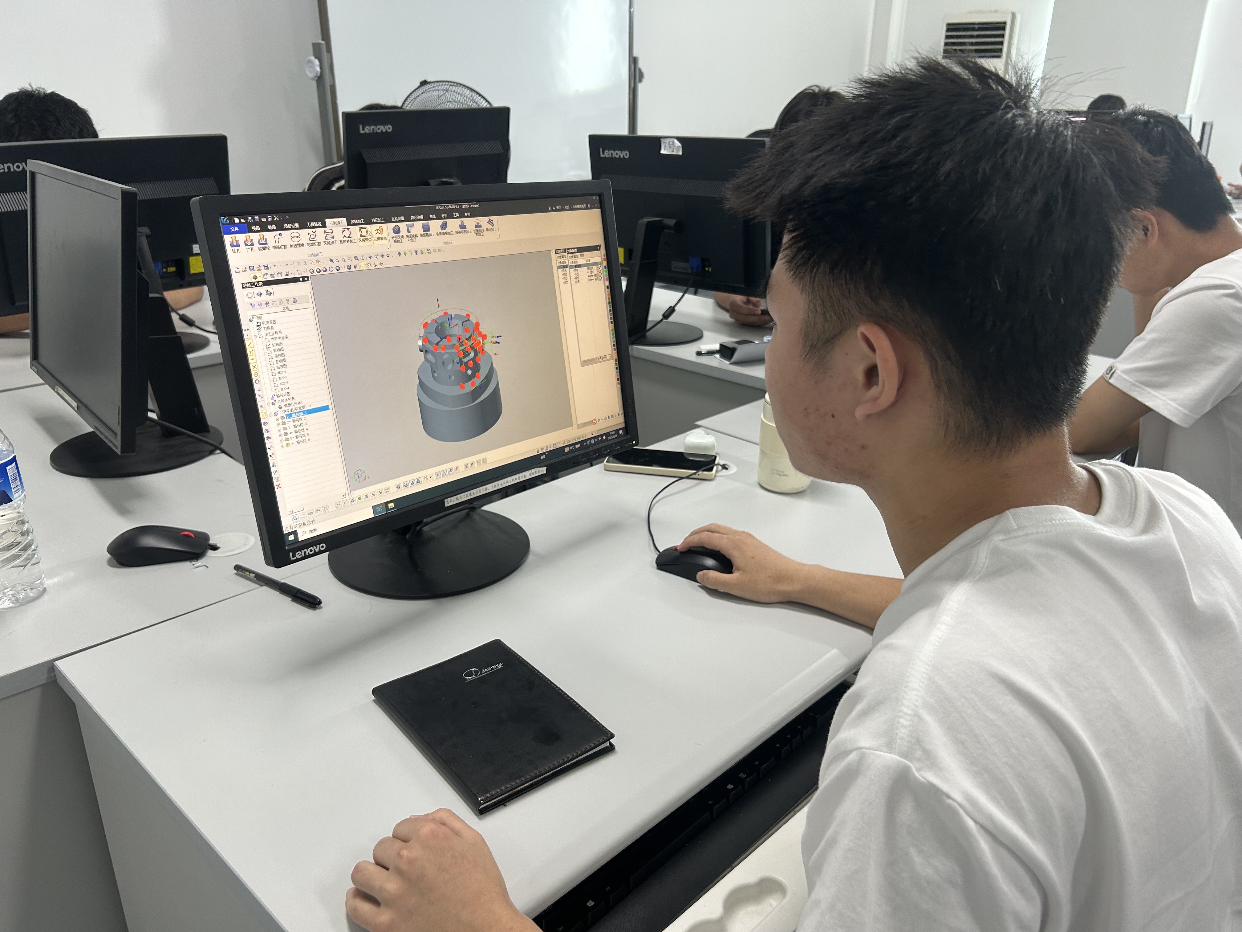 本次实习,学生以企业数控工程师的岗位,参与企业零件加工项目。培训老师首先进行了岗前劳动安全教育和公司的管理规定及注意事项介绍,使得学生更好更快地融入岗位实习工作中。岗前培训中,开展了精密加工管控技术、常见检测设备及应用等专业技术讲座,以及现场参观了三坐标等常见检测设备;指导学生使用数控编程软件SurfMill进行基本操作、点线面绘制、编程环境搭建等入门教学。