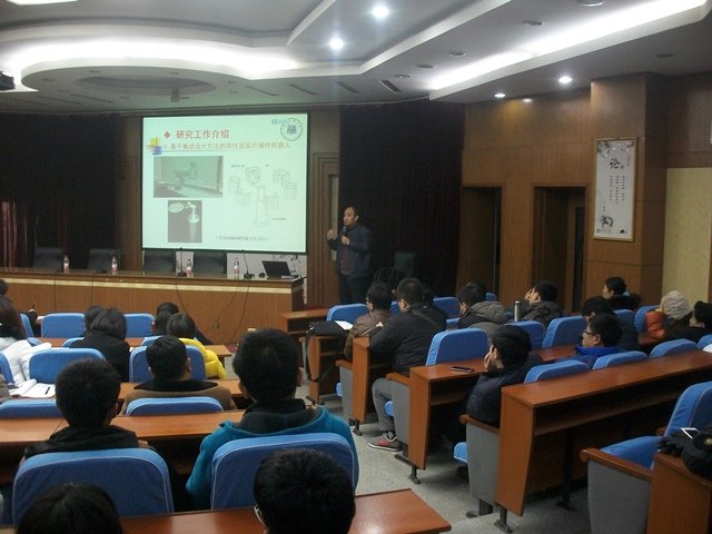早8:30,讲座在机电系副主任高英敏的主持下开展。首先,张建军教授介绍了机器人的分类,同时列举出机器人技术所涉及到的相关学科;随后,张教授深入讲解了并联机器人的理论和技术方面的专业知识,通过对比串联与并联机器人的不同,使观众们了解到并联机器人在运动机构的重量、运动的精度等方面显著的优势,在设计并联机器人上,运用运动学建模与分析、精度和误差建模、轨迹规划与运动控制、并联机器人的标定等理论,以此优化机器人机构参数和运动性能,查找误差源以提高操作精度,充分发挥并联机器人的高速、高精度运动性能;关于并联机器人的应用张教授援引工业机器人、模拟器、多轴数控机床、主操作手等实例让观众们了解到并联机器人在各种领域的广泛应用,利用仿生学、力学等原理,使机器人更加贴近观众们的实际生活;接下来,张教授向观众们详细介绍自身的科研工作,先后引用结构解耦微操作并联机器人系统、基于集成设计方法的高性能晶片操作机器人、高速搬运并联机器人、并联结构3D打印机等研究成果,让同学们感受到机械领域的魅力,引起师生对机器人的浓厚兴趣;最后,张教授指出机器人未来的发展方向,德国的工业4.0和中国制造2025都显现出未来机器人对于国家发展的重要性,机器人向着智能化方向不断靠拢,与人共融的智能机器人、3C领域的高速轻载机器人和服务型机器人势必会将工业制造水平推向一个前所未有的高度。10:00讲座在热烈的掌声中圆满结束。