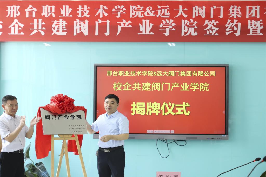 5月21日上午,我院与远大阀门集团有限公司共建的阀门产业学院在机电楼会议室召开了成立大会,会上举行了签约暨揭牌仪式,同时举行了远大阀门邢台职业技术学院大学生实习基地授牌仪式。参加会议的有邢台市教育局党组书记李建强、副局长杨彩霞,远大阀门集团有限公司总经理闫国安、铸铁分公司总经理于国峰、铸钢分公司总经理杜立波、人资总监秦淑琴,我院党委书记刘彩琴、副院长李贤彬、继教部主任冯旭敏、机电工程系书记马雪芳、主任高英敏等参加了大会。同时邢台市各大中专院校领导也莅临大会现场进行了产学研研讨。大会由高英敏主任主持。