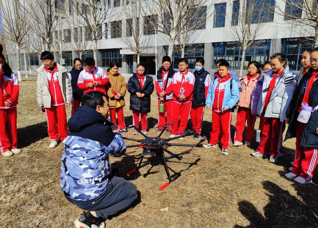 在无人机协同创意中心学生们了解了无人机的分类、结构与系统、飞行原理以及无人机的发展历史、现状与未来趋势,随后在室外进行了飞行演示。
