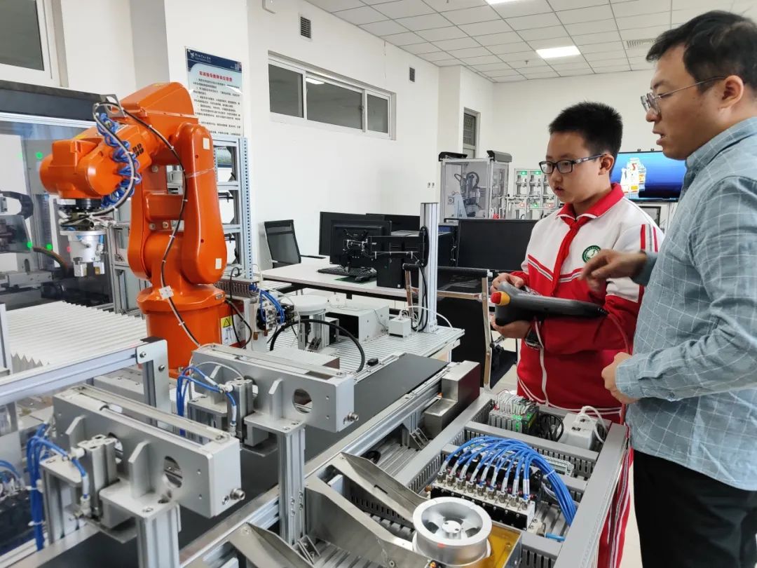 自动化生产线上,灵活的机械手精准地抓取、搬运、投放物料,给孩子们产生了极大震撼。学生们在老师的指导下进行沉浸式的体验。