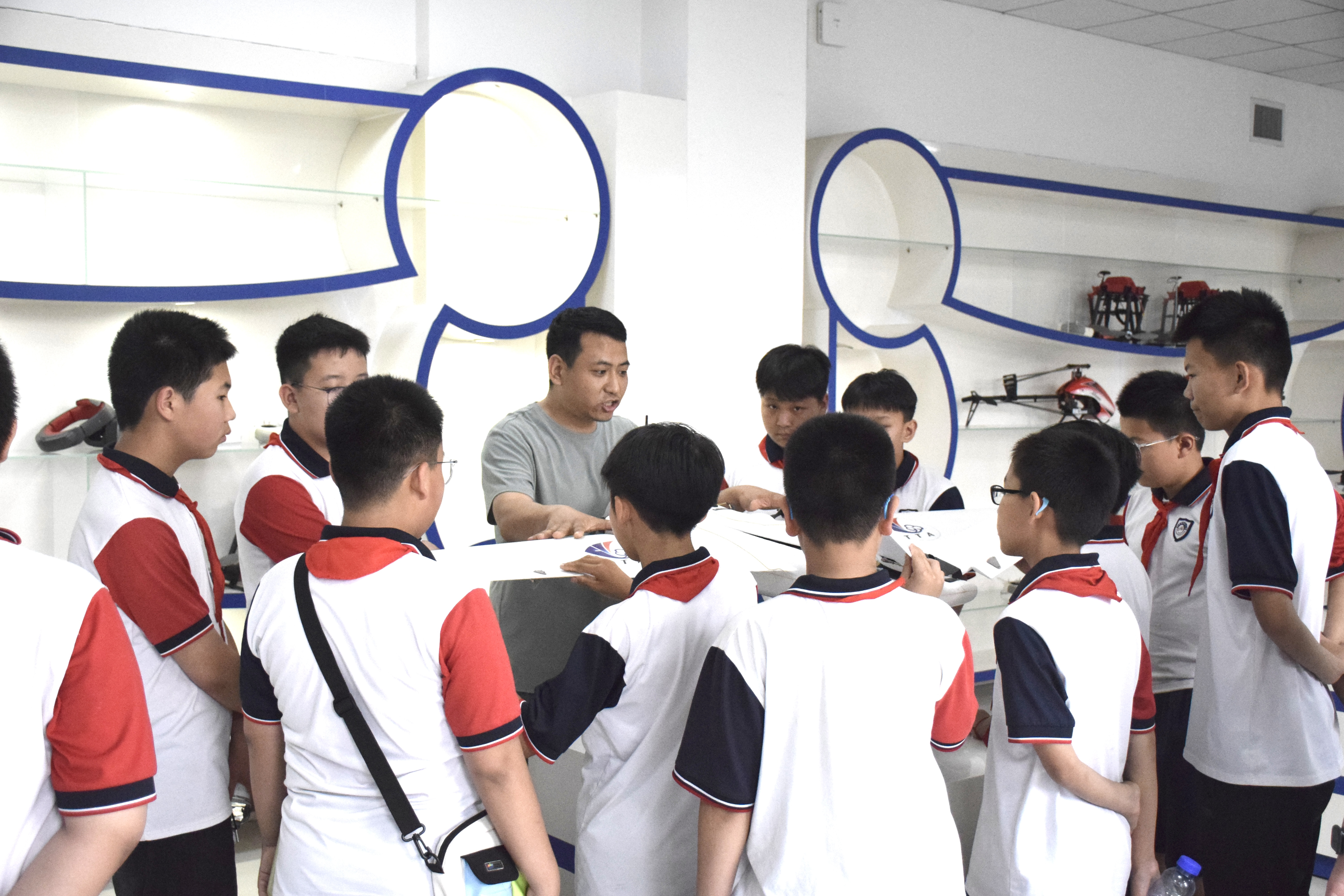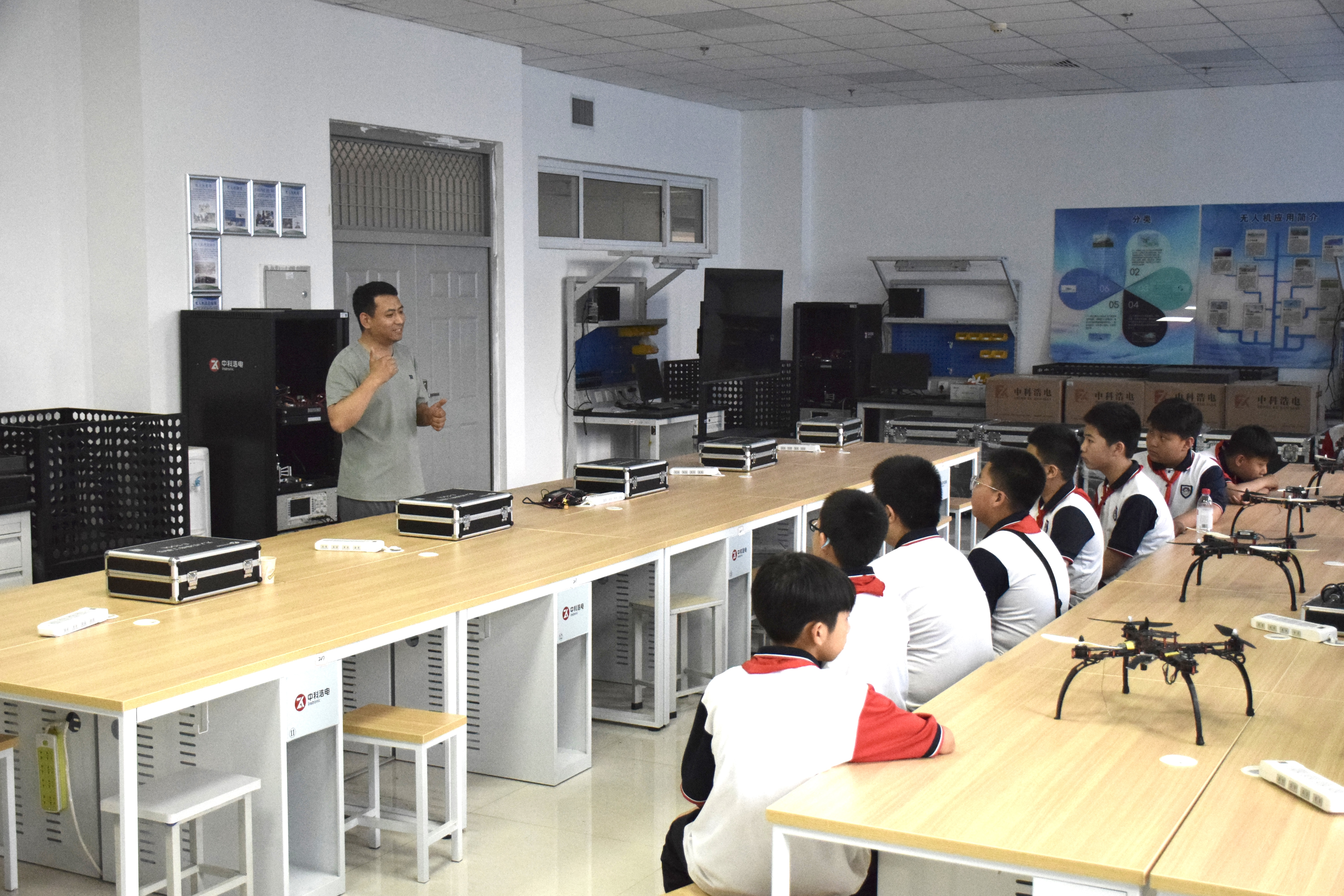 在无人机展厅,机电系老师系统讲解了无人机基础知识与发展应用,从无人机的飞行原理、核心构造,到其在航拍摄影、农林植保、地理测绘、应急救援乃至物流配送中发挥的关键作用,老师们用生动的语言和丰富的案例,描绘了无人机技术改变生产生活的广阔前景。展厅内陈列的不同类型无人机实体,配合老师的现场演示与互动答疑,让书本上的知识变得鲜活立体,同学们纷纷围拢在展台前,近距离感受无人机的科技魅力。