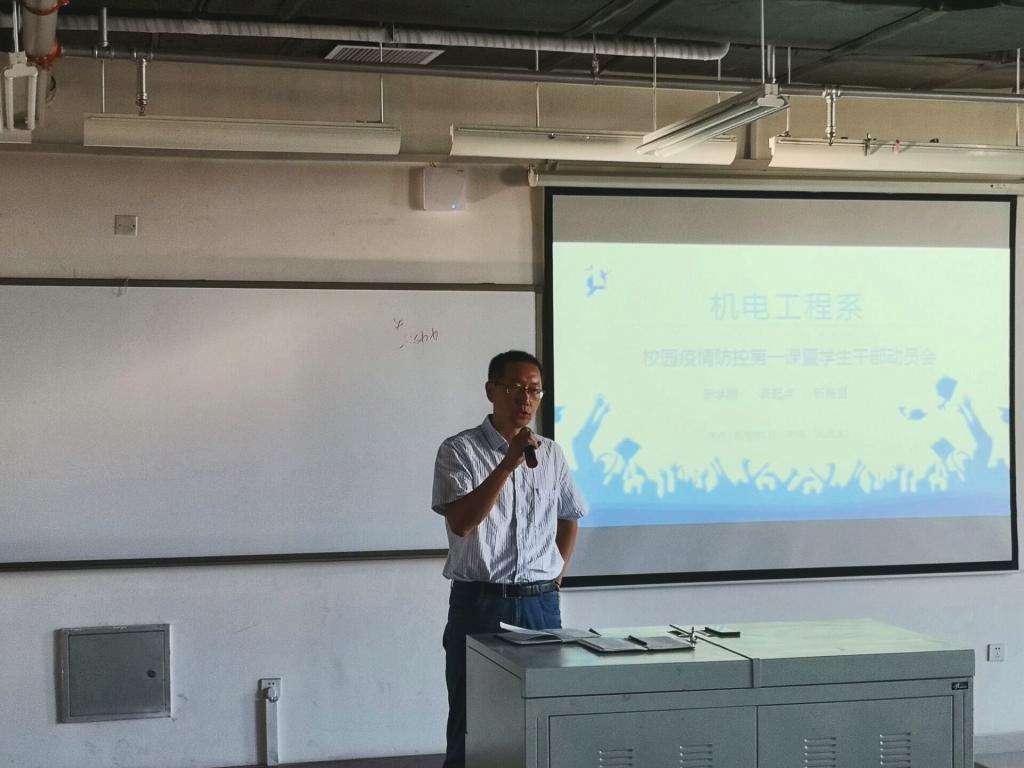 新学期,新起点,新希望。为了高效、有序推进本学期各项工作开展,加强学生对校园疫情防控的了解,及时调整状态收心课堂,机电工程系于9月3日下午在机电楼521教室组织召开了校园疫情防控第一课暨学生干部动员会。赵玉清副书记、全体辅导员老师出席本次会议,2018级班委、学生会团总支主要学生干部及宿舍长参会。会议由陈旭老师主持。