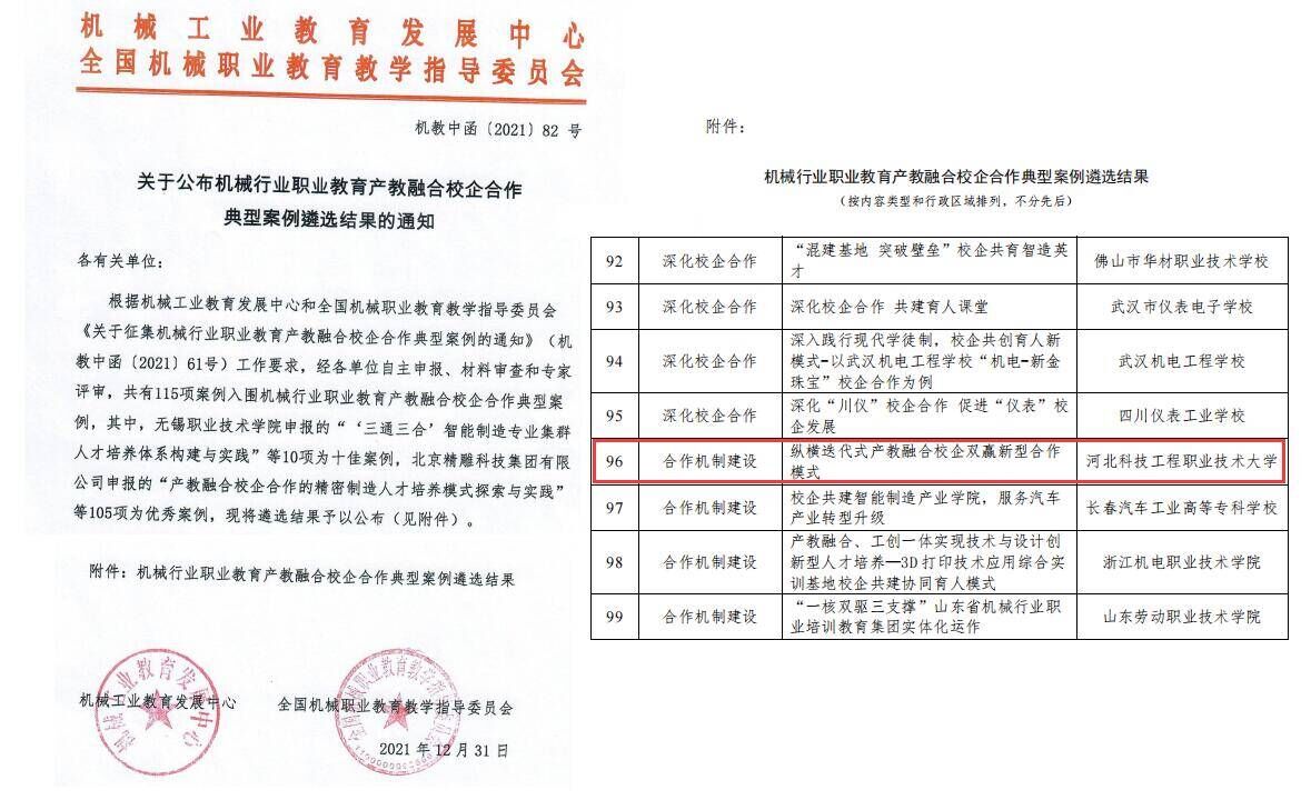 由机械工业教育发展中心和全国机械职业教育教学指导委员会联合征集的“机械行业职业教育产教融合校企合作典型案例”评选活动中,best365机电工程系报送的“纵横迭代式产教融合校企双赢新型合作模式”成功入选为优秀案例。