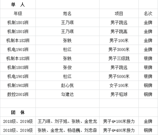 经过两天的激烈角逐,我系运动健儿斩获奖牌11枚:单人金牌4枚、团体金牌1枚;单人银牌3枚;单人铜牌2枚、团体铜牌1枚,男子团体总分136分。在运动会期间,机电工程系严格按照学院要求,保证了学生的出勤、卫生、纪律,获得了“优秀组织奖”。最终,我系以男子组团体总分第一名、团体总分第四名、“优秀组织奖”实现了比赛成绩和精神文明的双丰收。