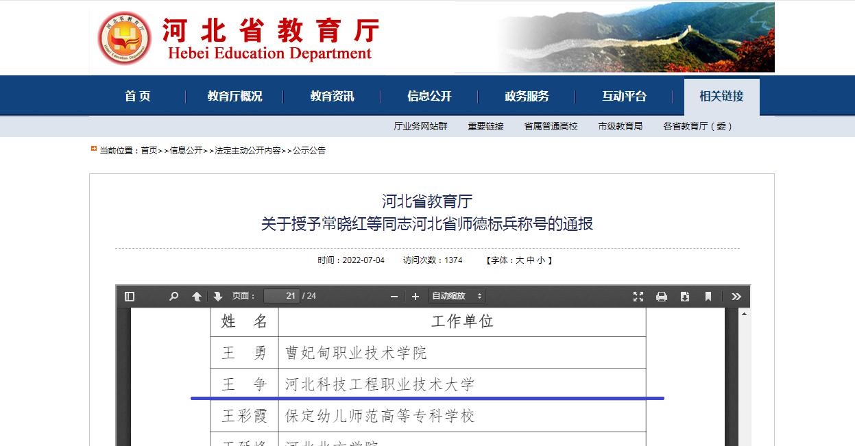 近日,河北省教育厅在“冀教师[2022]13号”文件对2022年获得河北省师德标兵荣誉称号的教师进行公示,建筑工程系教授王争荣获此称号。