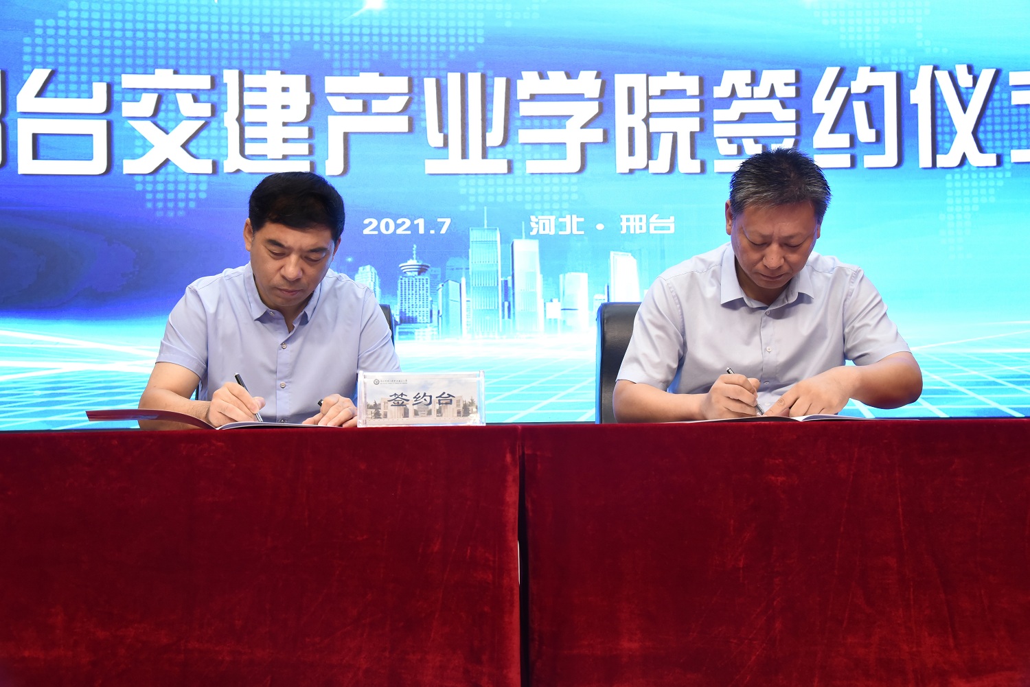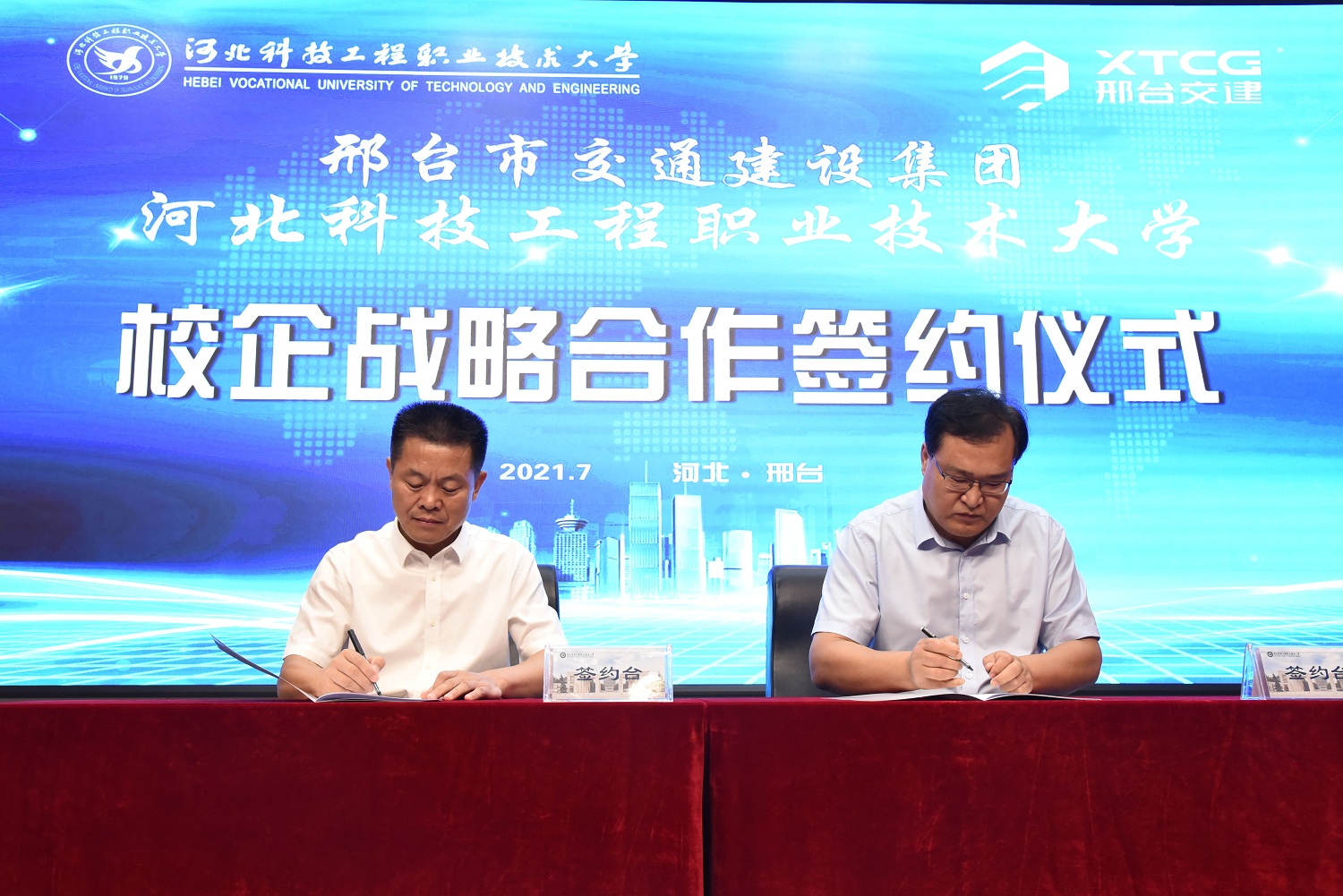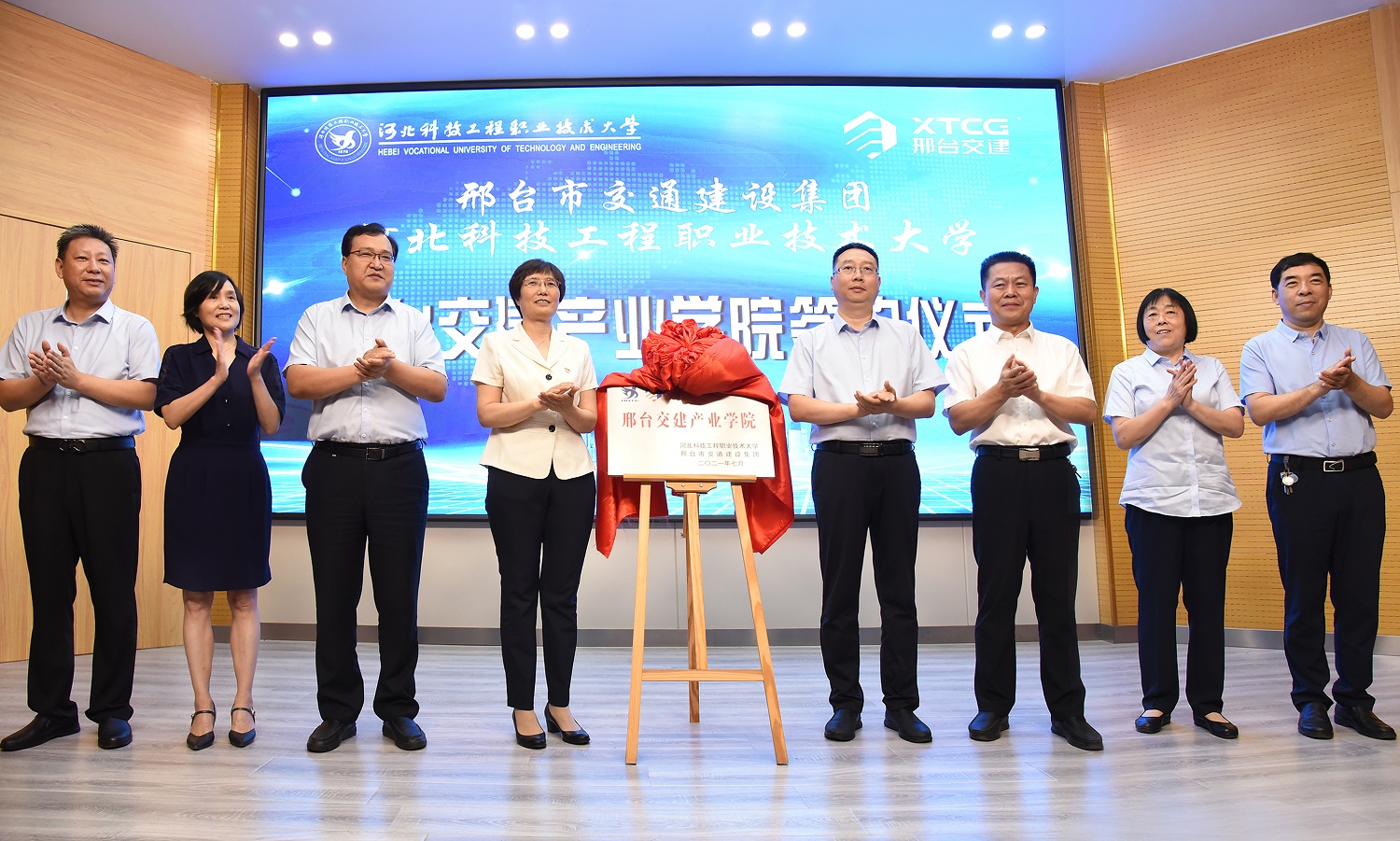 之后,马东霄校长与集团领导刘立军签署校企战略合作协议。李贤彬副校长与集团党委副书记、副总经理郑小刚签署邢台交建产业学院协议。集团马骅董事长与刘彩琴书记共同为邢台交建产业学院揭牌,与会的各位领导也一同上台见证此次揭牌仪式。
