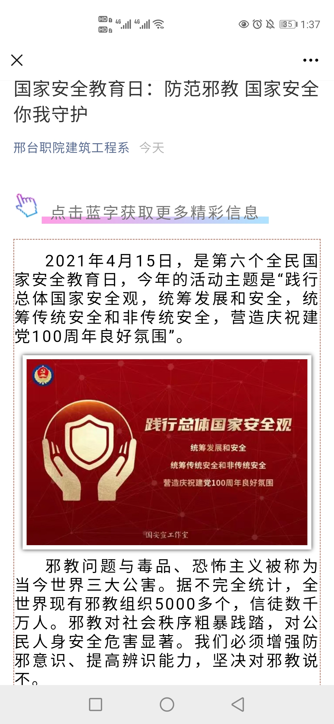 4月14日下午,石旭老师在大讲堂为学生干部开展了国家安全教育讲座。4月15日,各班利用课余时间召开主题班会,介绍国家安全日设立背景、现实意义以及公民维护国家安全的义务,深入开展了反邪教宣传。与此同时,在我系QQ和微信公众号上也普及了国家安全和防范邪教的相关知识,营造了关注国家安全的良好氛围。