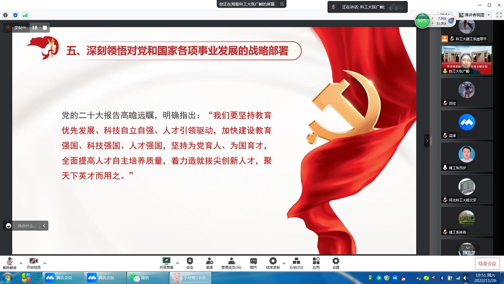 为深入学习宣传贯彻党的二十大精神,11月26日晚,建筑工程系副主任张广峻组织我系全体专任教师在线上开展以“学深悟透新思想,踔厉奋发新征程”为主题的党组织生活会。