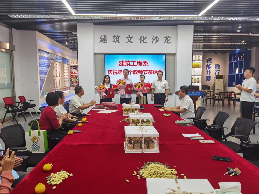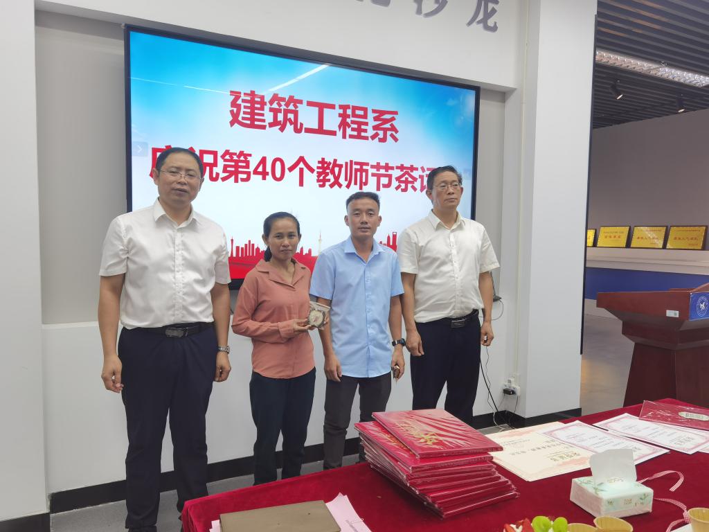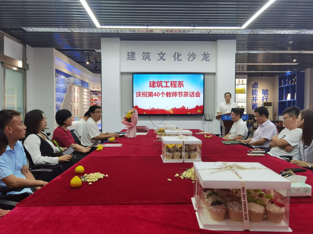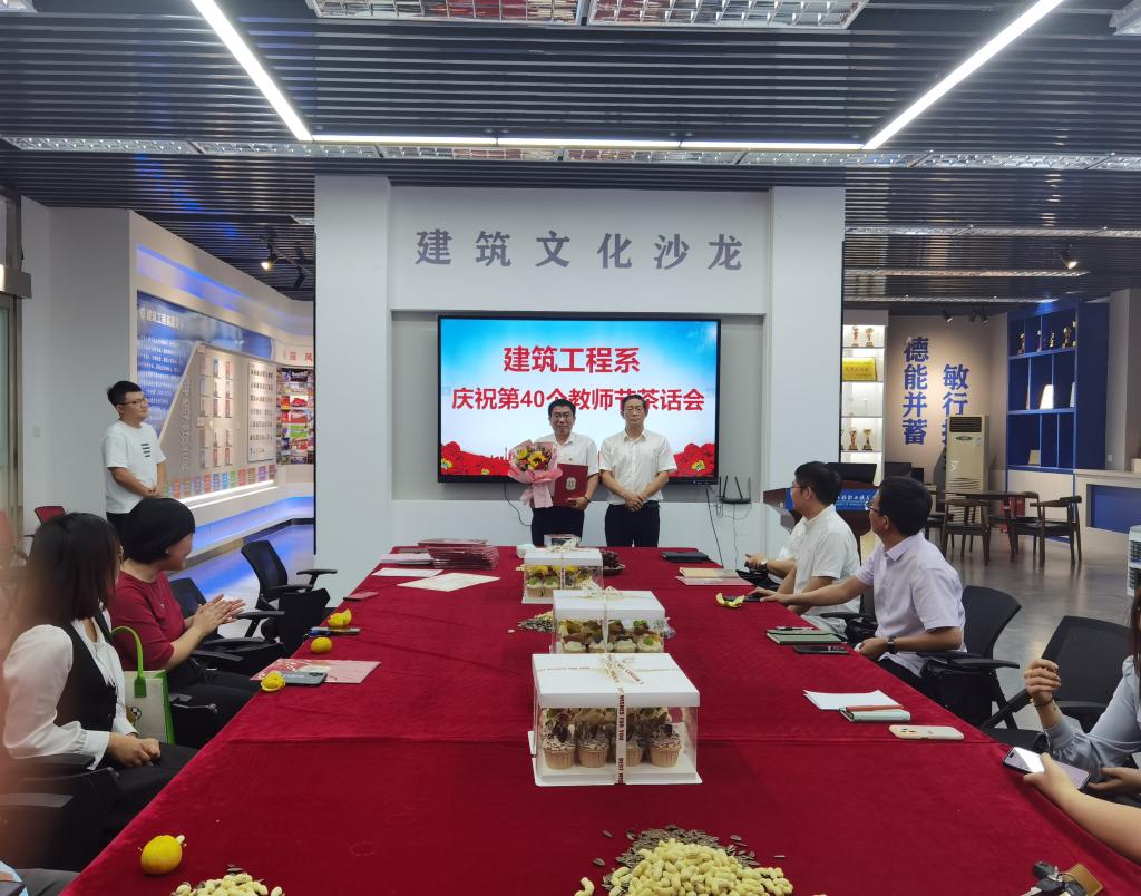 9月11日下午,我系在建筑工程技术中心104召开庆祝第40个教师节茶话会,全系教师欢聚一堂,共话系部发展与个人成长,我系两名老挝留学生也应邀来到现场,与教师一起欢度节日。