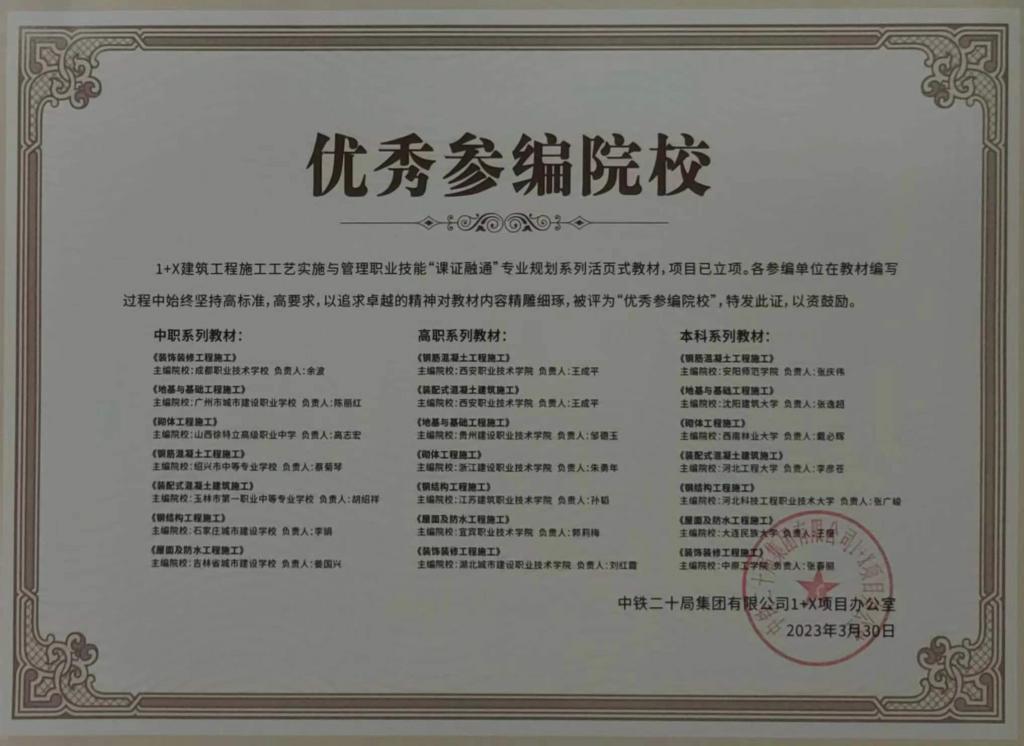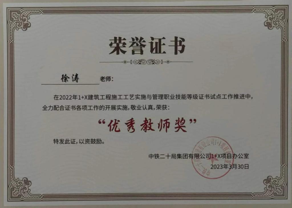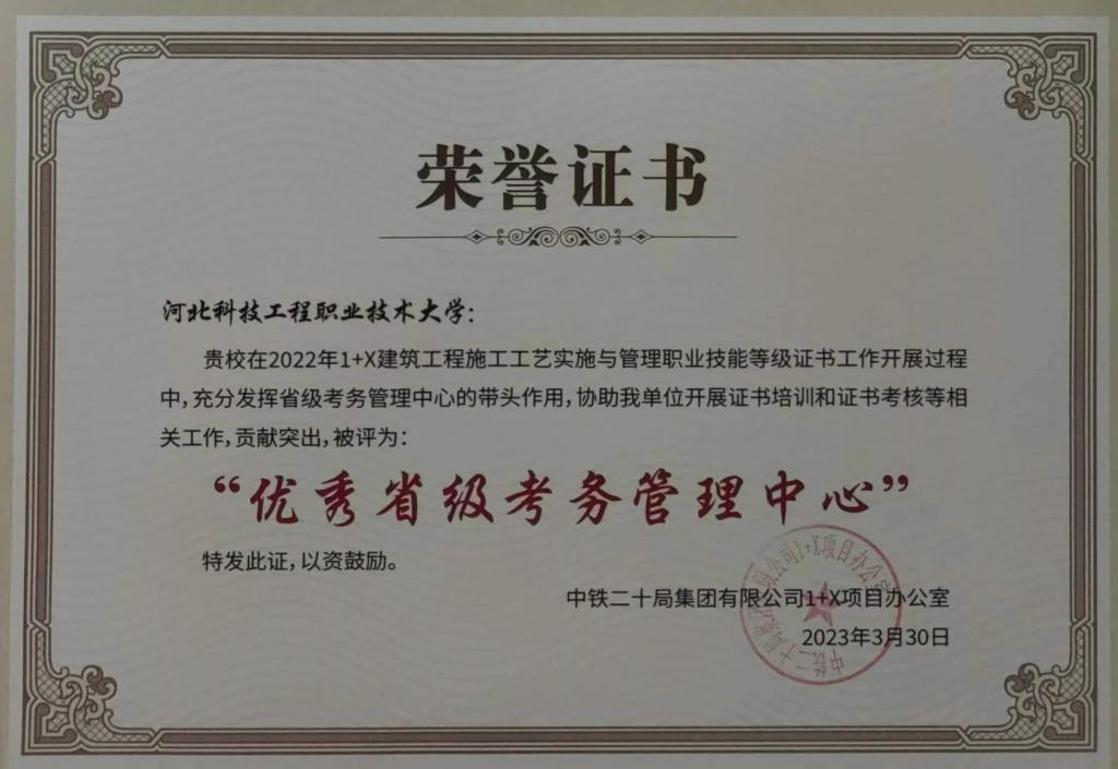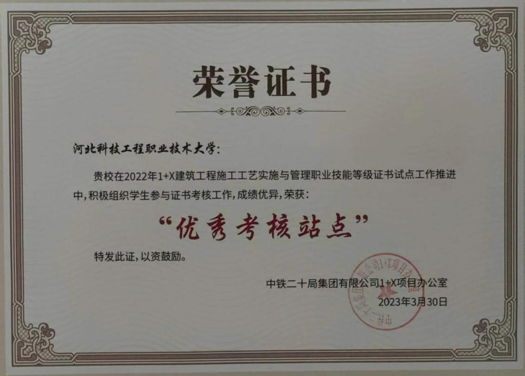2022年,best365在“1+X”建筑工程施工工艺实施与管理职业技能等级证书考试工作中,成绩突出,得到中铁二十局集团“1+X”项目办的肯定,best365中级、高级职业技能等级证书考核过关率双双获得100%,best365共获得优秀省级考务管理中心、优秀考核站点、配套教材优秀参编单位和优秀教师四项荣誉证书。