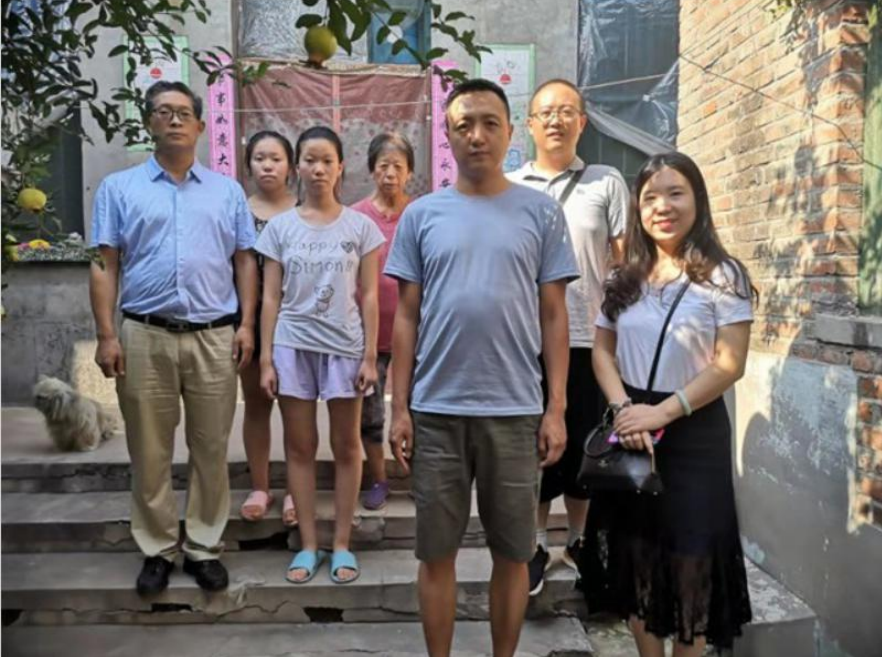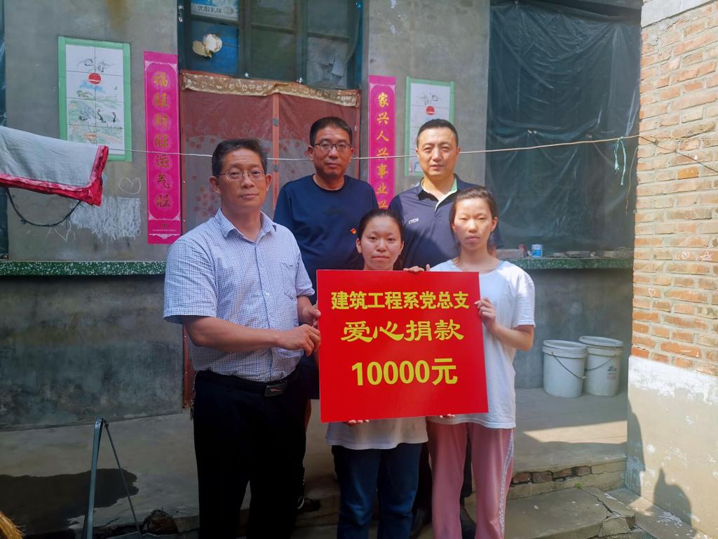 2021年7月7日下午,建筑工程系党总支刘志忠书记、李宁副书记等一行四人再次来到信都区李村乡东户村,把饱含建筑工程系满满关爱的1万元爱心捐款交到闫子文、闫子红姐妹手中,并对妹妹闫子文考上“科工大”钢结构专业表示祝贺!