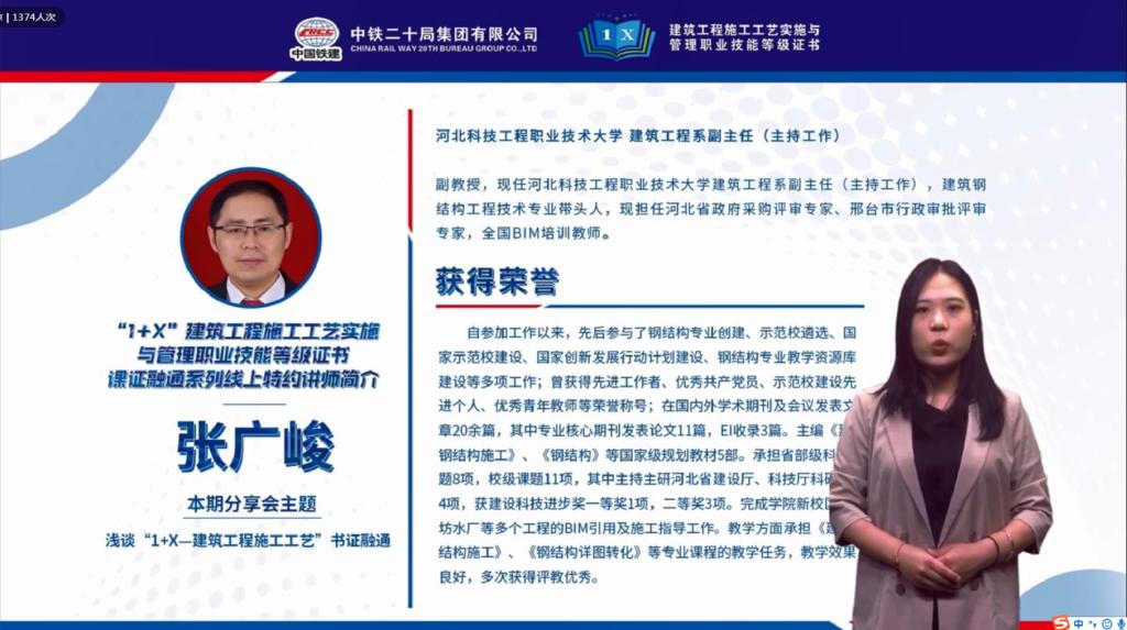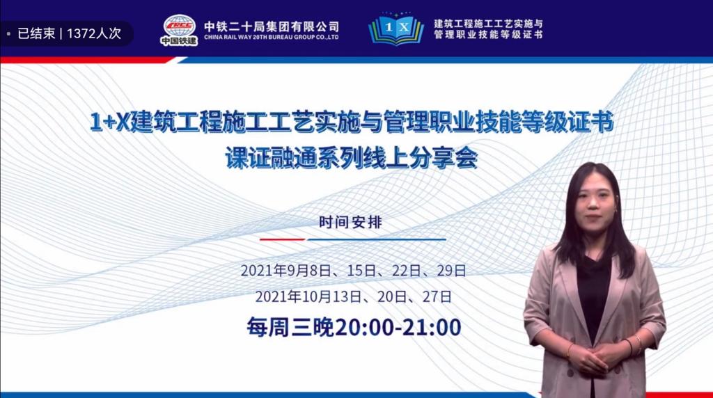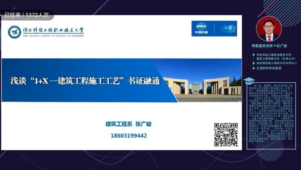 9月22日晚,由中铁二十局主办的“1+X”建筑工程施工工艺实施与管理职业技能等级标准全国线上培训班(第二期)正式开班。我系副主任张广峻副教授受邀向全体参培教师作《“1+X”建筑施工工艺书证融通与课程改革》专题报告,向全国“1+X”证书试点单位传播科工大经验,输出科工大做法,受到了参培教师的一致好评。