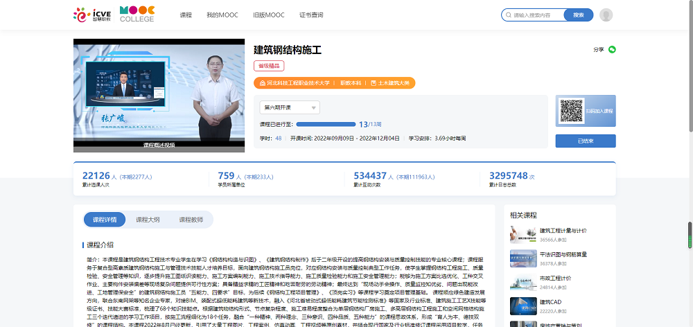 《建筑钢结构施工》课程在智慧职教MOOC学院已经开设六期,学员累计22126人,所属单位759个。课程面向建筑钢结构施工员岗位,使学生掌握钢结构工程施工、质量检验、安全管理等知识,逐步提升施工图纸识读能力、施工方案编制能力、施工技术指导能力、施工质量检验能力和施工安全管理能力;能够为施工方案比选优化、工种交叉作业、主要构件安装偏差等现场复杂问题提供可行性方案;最终达到“现场动手会操作、质量监控知优劣、问题出现能改进、工地管理保安全”的建筑钢结构施工员“五能力、四要求”目标。