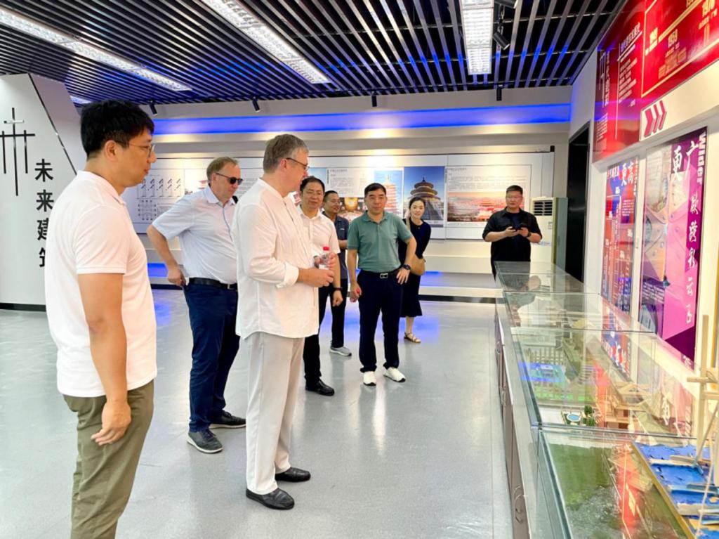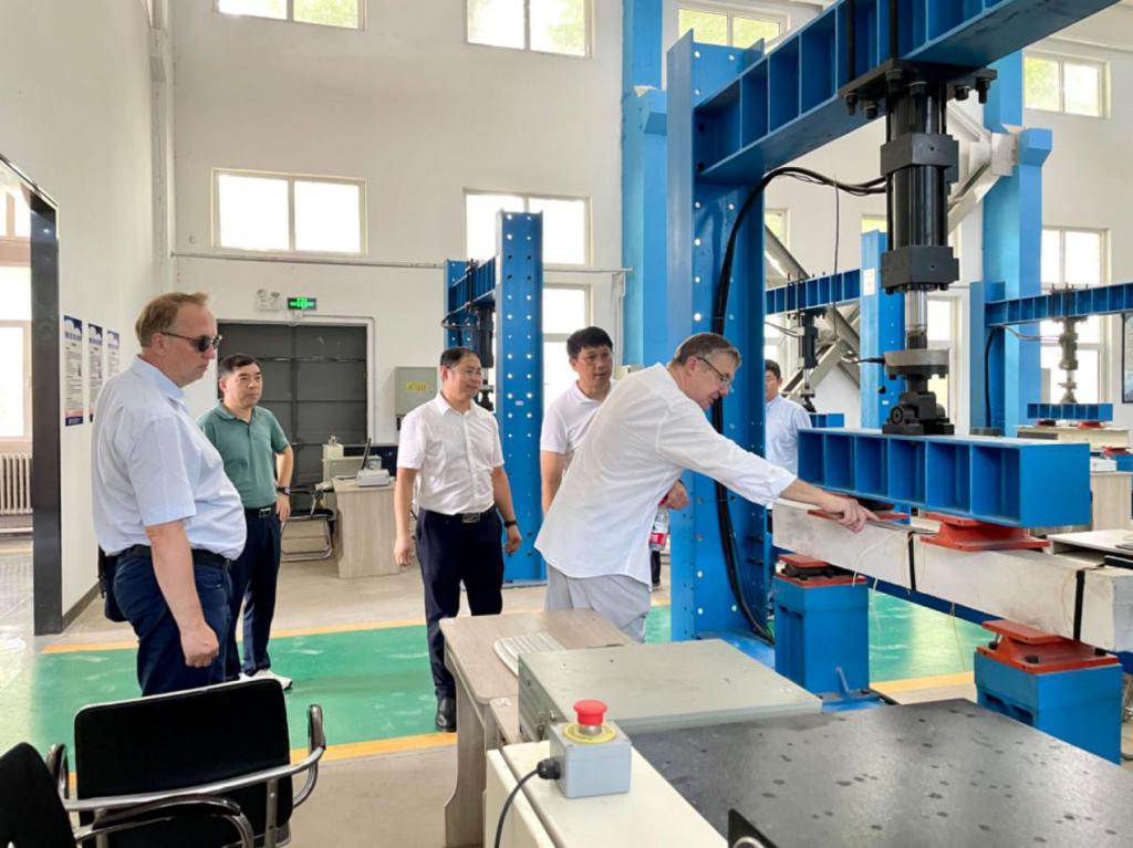 7月26日,德国萨克森双元制应用技术大学校长汉塞尔教授、副校长施韦泽教授一行到我系交流参观。在副校长李贤彬、建筑工程系主任张广峻、副主任崔立杰与实训中心教师们的陪同下,与德方一行参观了建筑工程技术中心。