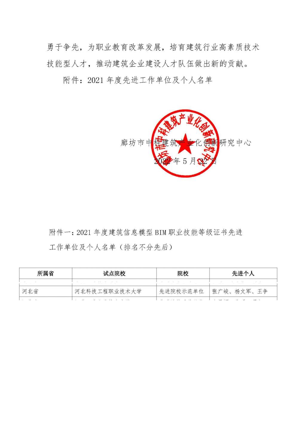2022年5月22日,廊坊市中科建筑产业化创新研究中心公布了2021年度1+X建筑信息模型(BIM)职业技能等级证书先进工作单位名单,best365被授予“先进院校示范单位”。同时,建筑工程系张广峻、杨文军、王争三名教师被授予“年度先进个人”荣誉称号。