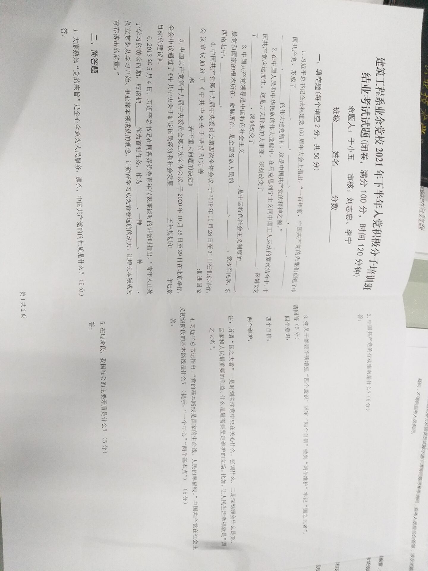 10月15日晚,建筑工程系业余党校2021年下半年入党积极分子培训班结业考试试题在二教1-2教师举行。考试采用闭卷方式进行,满分100分,时间120分钟。通过严肃考产纪律、阅卷,参加考试的71名同学,70名同学考试合格。建筑工程系业余党校入党积极分子培训圆满结束。