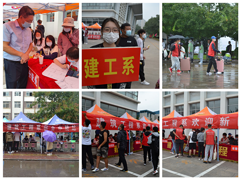 我系新生接待处设在体育馆北侧,红色的迎新条幅,人性化的道路指示,面带微笑的志愿者,彰显了建筑工程系良好的精神面貌。志愿者们的服务精神展现在每个细节之中:带领新同学办理入学手续、搬运行李、领取被褥……哪怕天空下起绵绵细雨,他们的热情依旧未减,主动提供雨具护送新生,既暖心又高效。期间,我系领导和老师还深入宿舍,为新同学们送上嘱托和关怀。