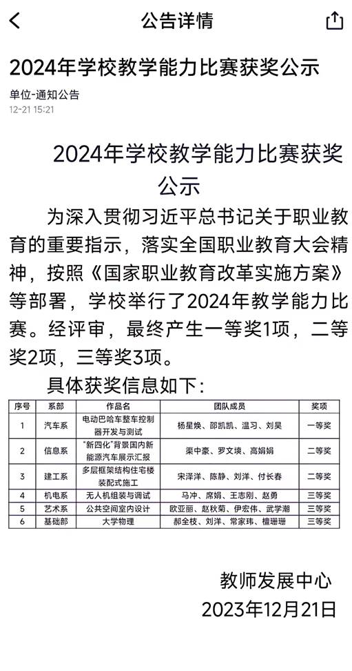 2024年河北省教师能力比赛校选拔赛拉下帷幕,我系在校赛中获得二等奖优异成绩,顺利进入省赛备赛阶段。由于本项赛事赛制改革实行第一年,在系领导刘志忠书记、张广峻主任的大力支持下,在实训中心以及广大教师的协助下圆满完成比赛。我系教师团队宋泽洋、陈静、刘洋和付长春老师以及参赛学生在比赛中展现了良好的的精神风貌,克服困难,迎难而上,乘风破浪,斩获佳绩。
